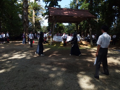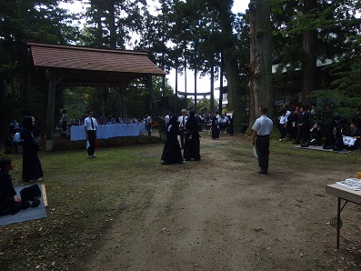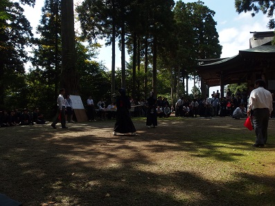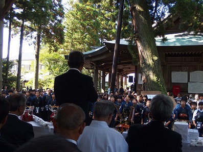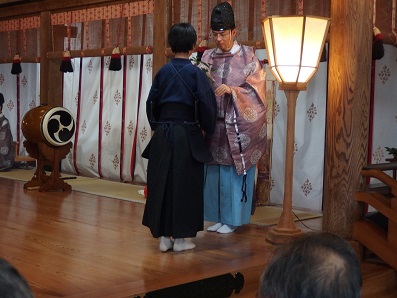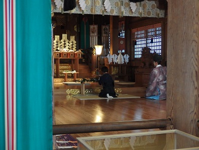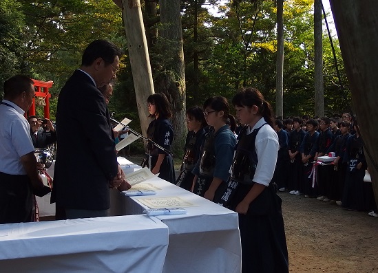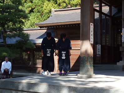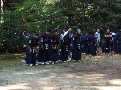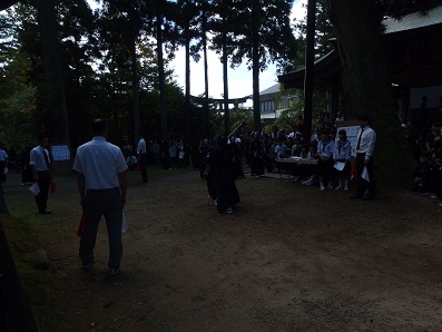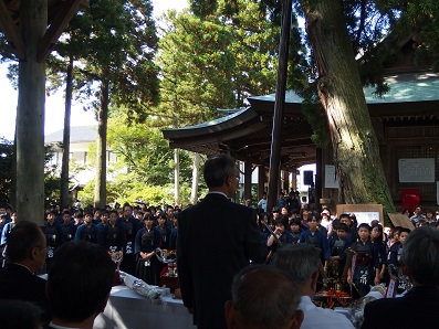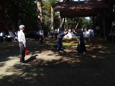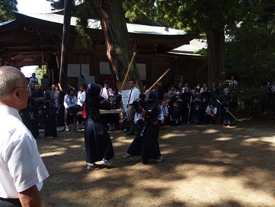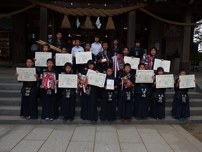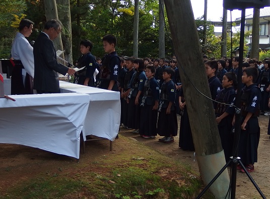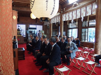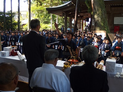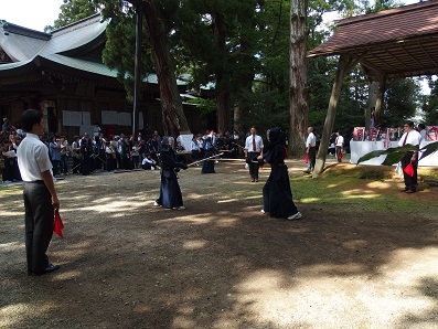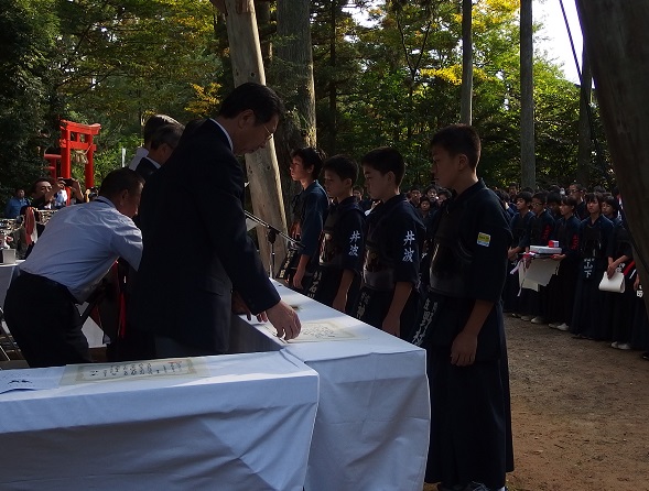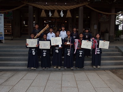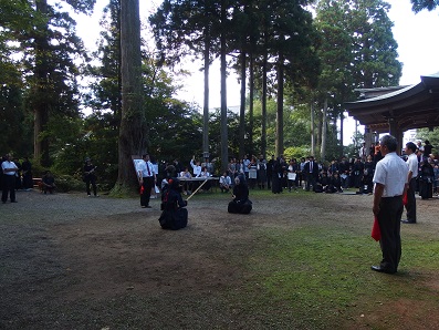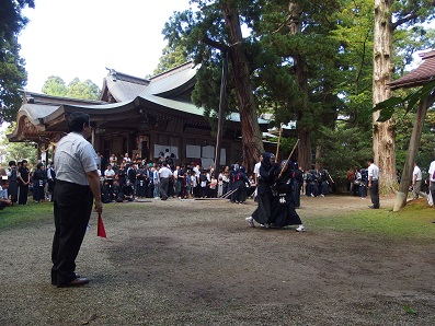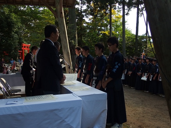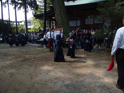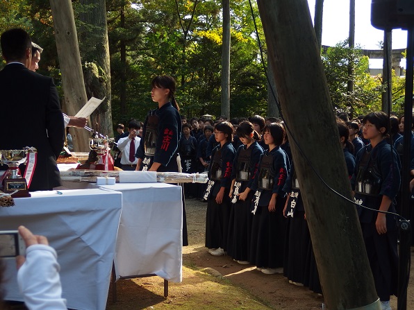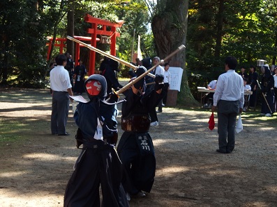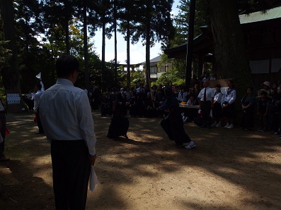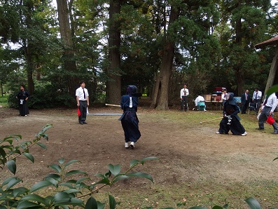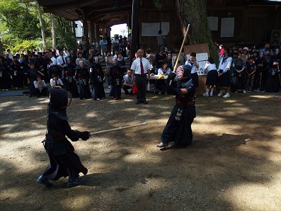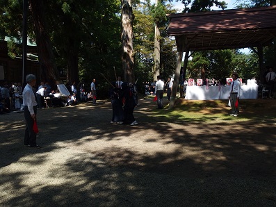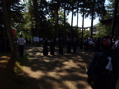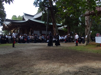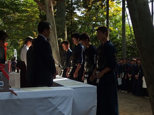![]() 高瀬神社神前にて、剣道大会の報告祭 |