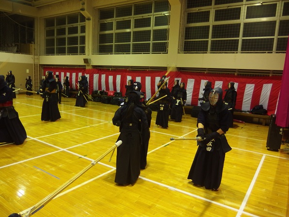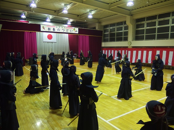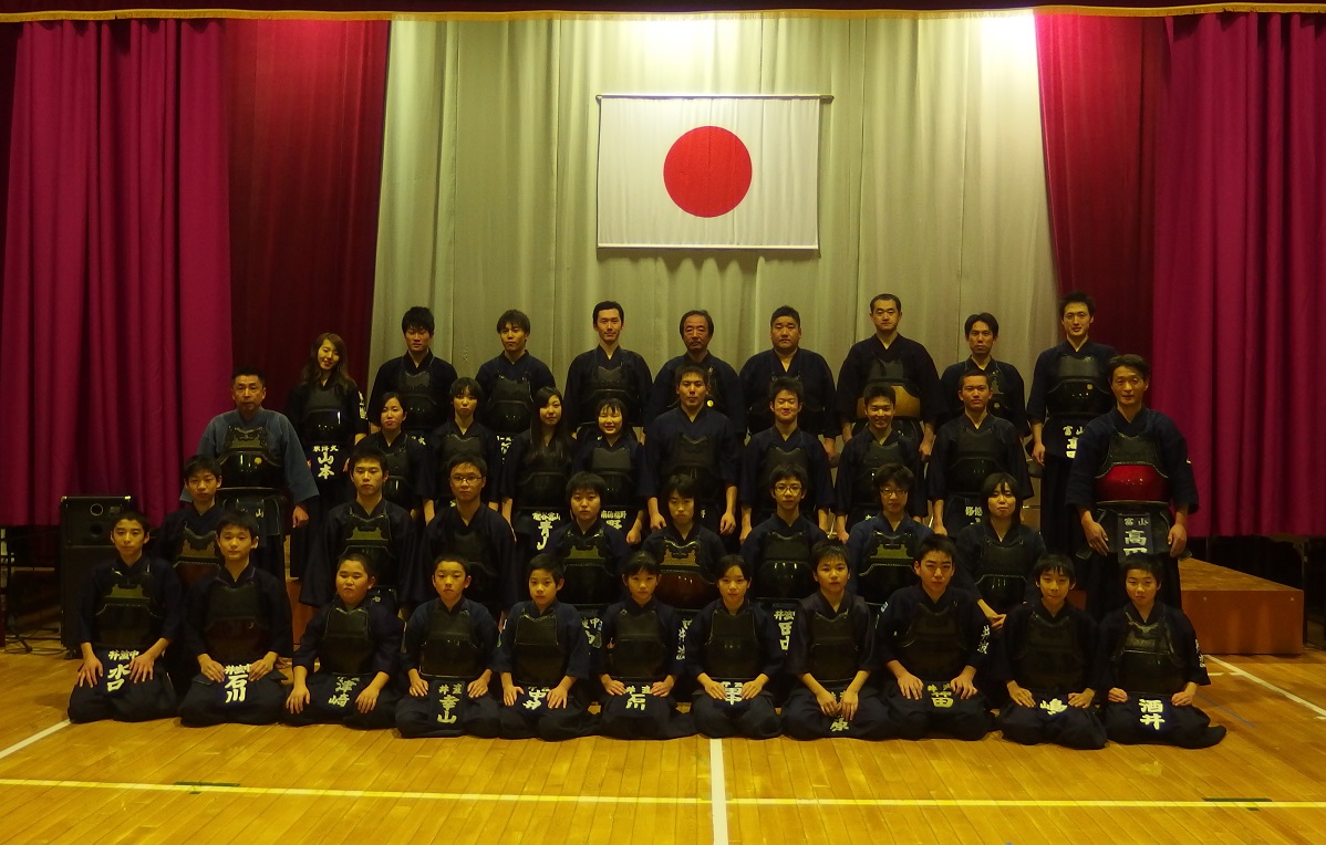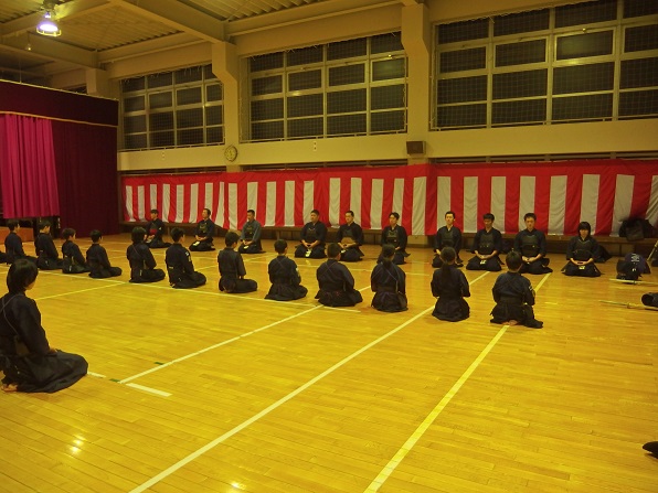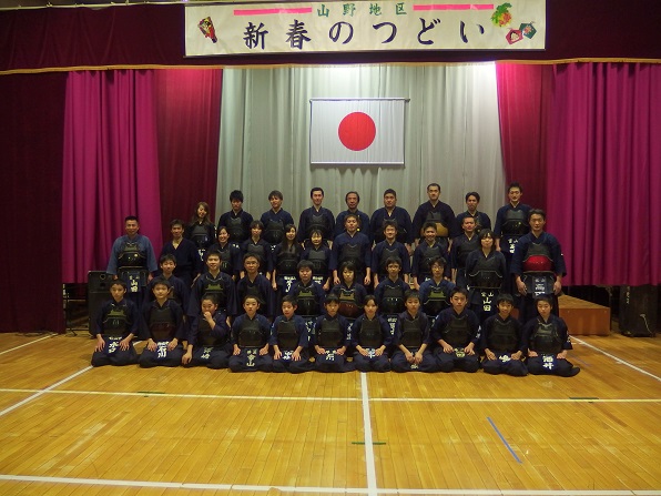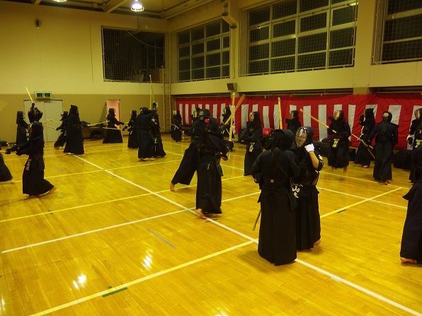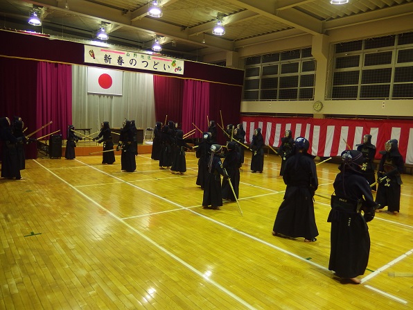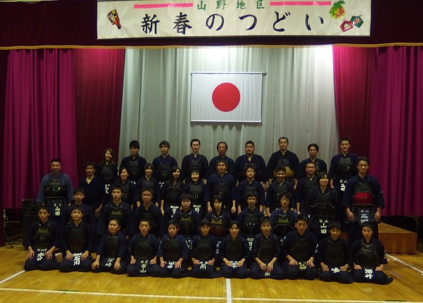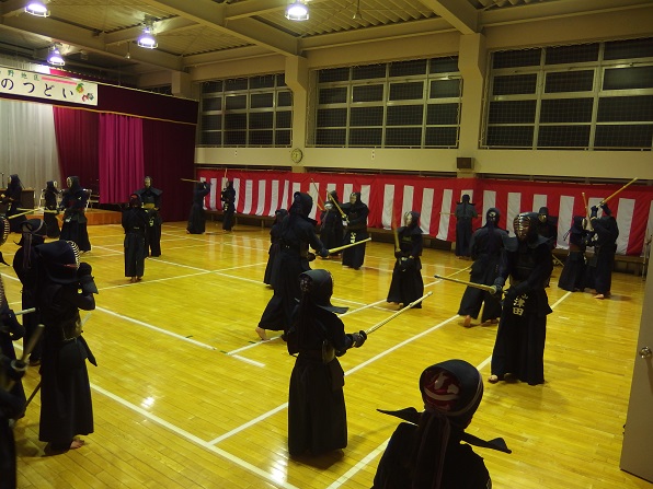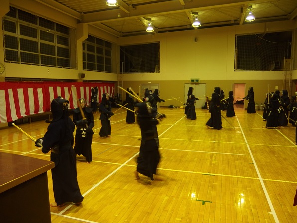 平成26年―27年井波剣友会年越し稽古(南砺市山野公民館体育館) 平成26年12月31日午後11時より、井波剣友会恒例の年越し稽古・・・平成27年1月1日午前1時 稽古終了後、年越しそばを頂き、越中一宮高瀬神社に初詣 稽古終了後の記念写真(スポ少団員、高校生・大学生のOB/OG、指導者の先生方、一緒に撮影)
