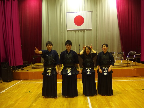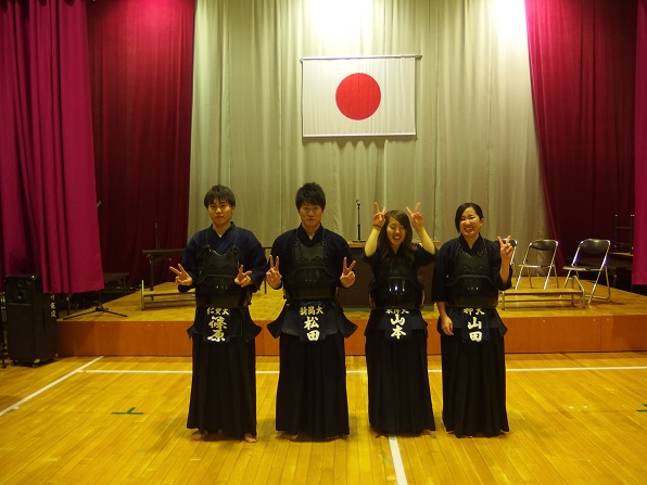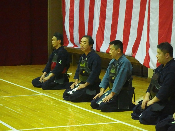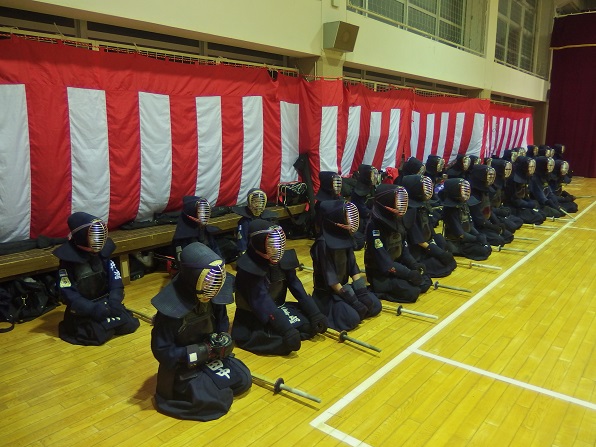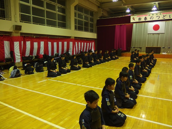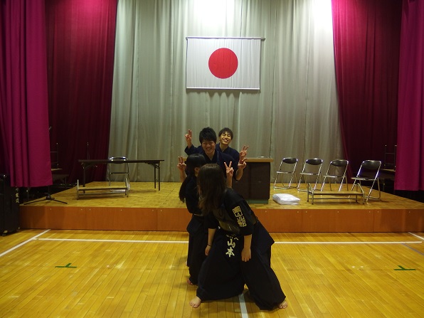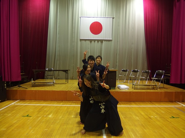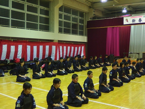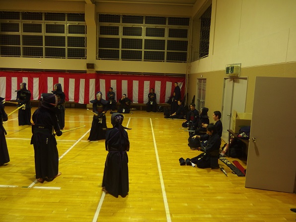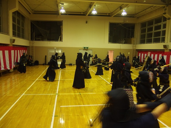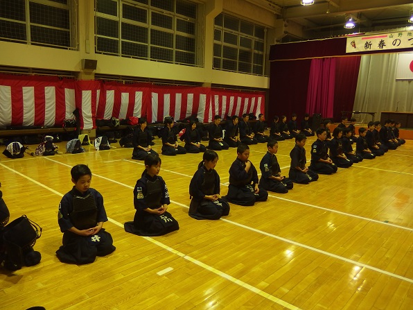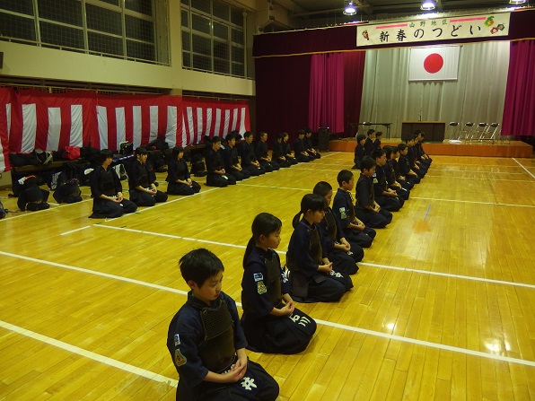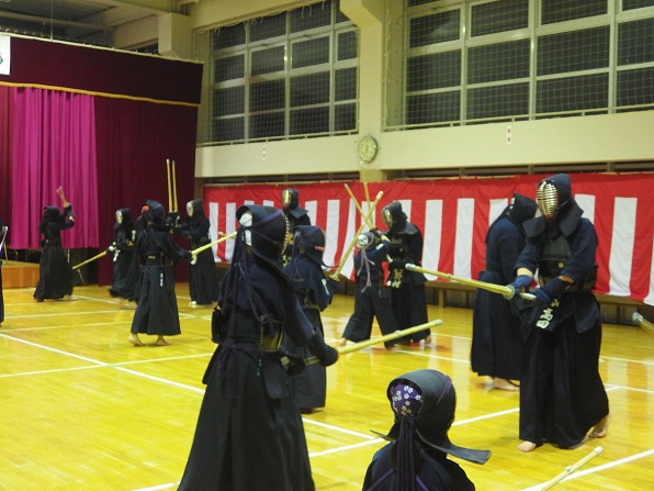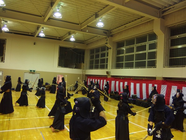 平成26年―27年井波剣友会年越し稽古(南砺市山野公民館体育館) 平成26年12月31日午後11時より、井波剣友会恒例の年越し稽古・・・平成27年1月1日午前1時 稽古終了後、年越しそばを頂き、越中一宮高瀬神社に初詣 稽古終了後の記念写真(スポ少団員、高校生・大学生のOB/OG、指導者の先生方、一緒に撮影)