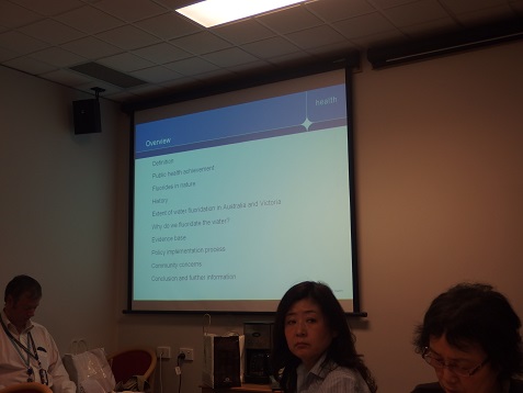 (山内副会長の挨拶) 本日は、私達日本のNPO-JPUFグループを受け入れて頂き、誠に 有難うございます。私達は長年日本国内で、Water Fluoridationの啓発を 行っているグループです。 今回は、同じグループの晴佐久先生がこちらのメルボルン大学に滞在中 の機会を活かして、モルガン教授及び関係者の皆さんのご協力があったら こそ、私達はこちらを訪問する事が出来ました。有難うございます。 過去において、日本でもWater Fluoridaition を実験的に行われた地域が 何カ所かありました。例えば、沖縄が1970年代日本に返還されるまでは、 実施されていましたが、現在はされておりません。また、日本国内では、 何カ所か自然飲料水の中にちょうど良い濃度の所もあり、むし歯予防に 役だっています。しかし、日本国内では、調整して実施されているところは ありません。今日一日の研修と質疑応答、意見交換を通じて、日本の現状 を理解して頂き、皆さんから、ご助言・御指導を頂ければ、有難いです。 私達は、日本に今日の大事なお話を持ち帰って、専門家や一般の方々 までに伝えたいと思います。 今日は、本当に有難うございます。 |