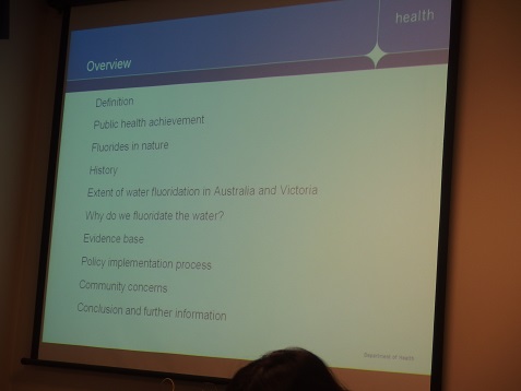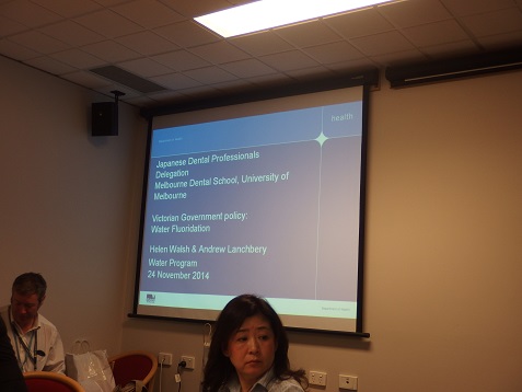 | *日程 2014年11月24日(月) 9:00〜9:10 開会の辞 Mike Morgan(メルボルン大学歯学部教授・副学部長) 山内皓央(NPO法人日F会議副会長) 9:10〜11:00 Helen Walsh(保健局水道健康予防課チームリーダー) Andrew Lanchbery(保健局水道健康予防課上級技術指導官) 12:10〜13:30 Sylvan浄水場にて、水道水フロリデーション施設見学 14:10〜16:30 Yarra Valleyの Domaine Chandonにて、懇親会および水道水フロリデーションに関する質疑応答 (回答者) Helen Walsh(保健局水道健康予防課チームリーダー) Rodrigo Marino(メルボルン大学歯学部教授) *日程(その2) 2014年11月25日(火) メルボルン大学 9:30〜 ポケット水質検査計による水道水フッ化物濃度調査 山本武夫、晴佐久悟 |