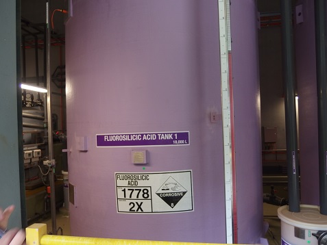Sylvan浄水場の添加装置の施設前にて、集合写真(施設訪問者には、ゴーグル、保護衣着用が義務つけられている)
