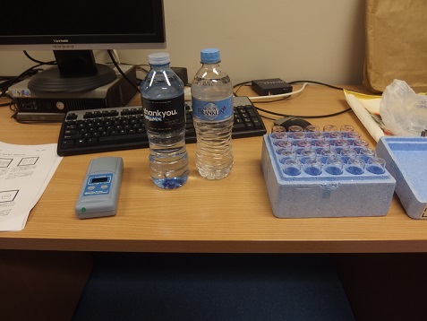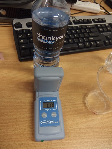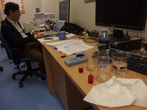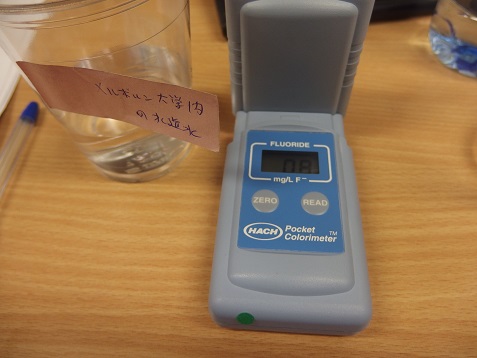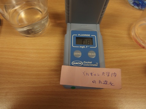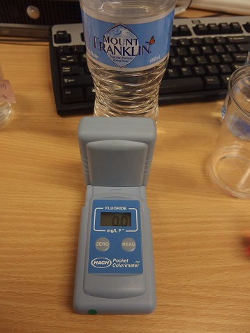 *メルボルン大学内にて、ポケット水質検査計による水道水フッ化物濃度検査