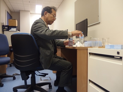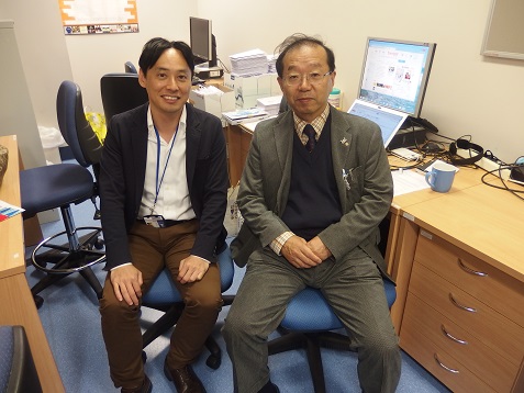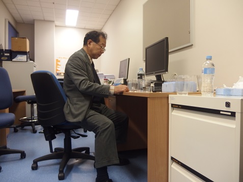 ![]() 晴佐久先生のデスクの前で!協力、有難うございました。 後しばらくの留学期間中に、頑張って研修を重ねて下さい。 |