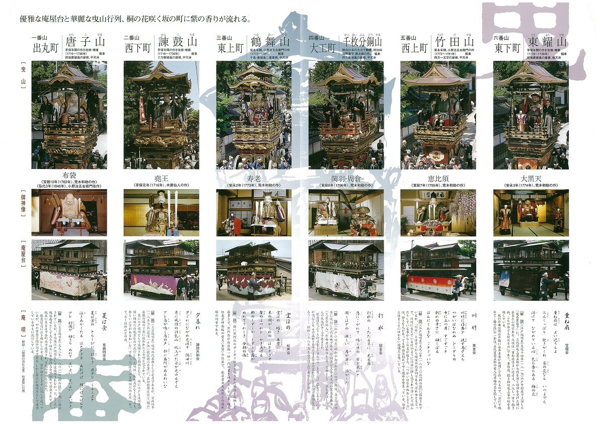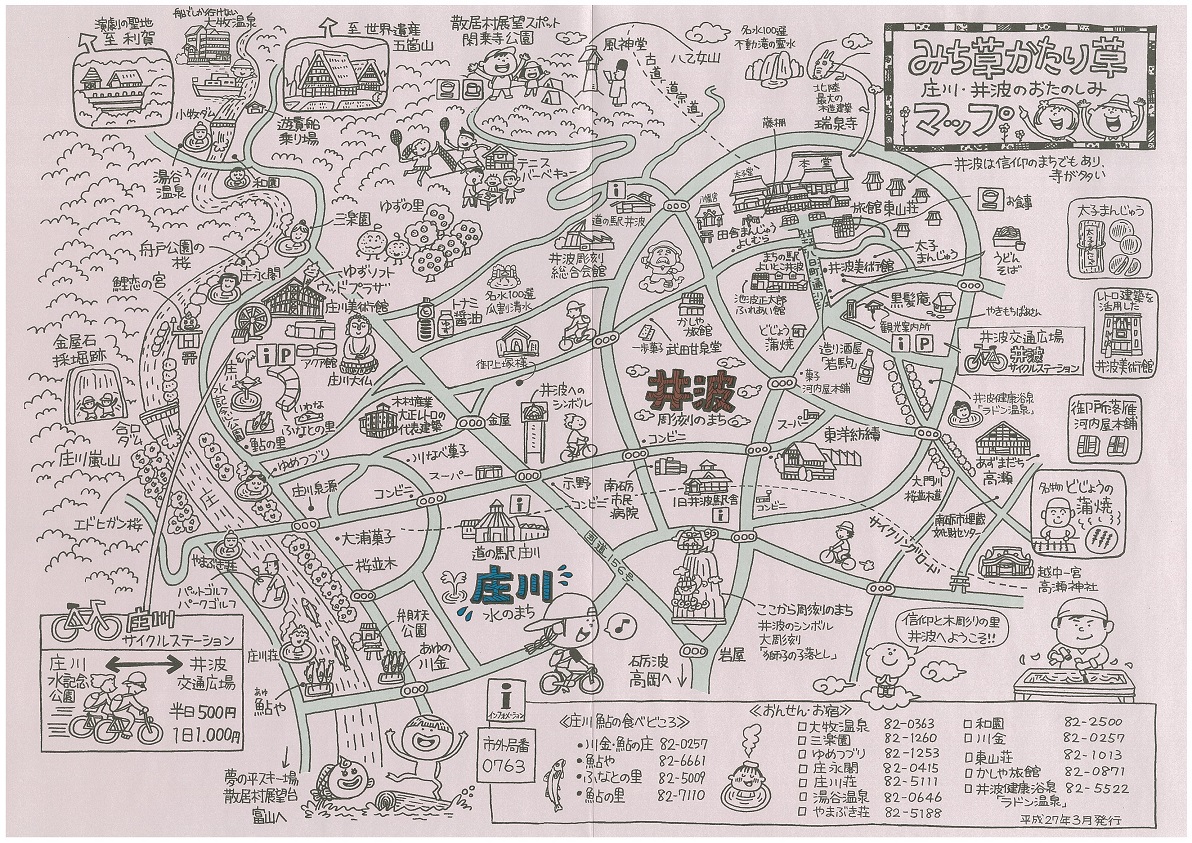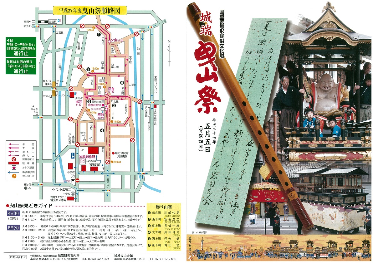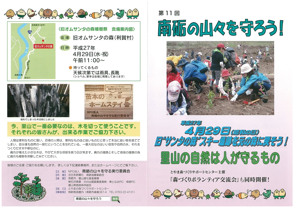 東となみロータリークラブ 2014-15年度(坂井年度) 第1765回例会 資料集 2015年(平成27年)4月15日 資料@ 次年度役員 A 平成27年度城端曳山祭り パンフレット B 金屋石パンフレット C 庄川・井波「みち草語りマップ」 D 庄川金屋石をさがそうマップ C 「南砺の山々を守ろう」植樹祭パンフレット(2015年版)