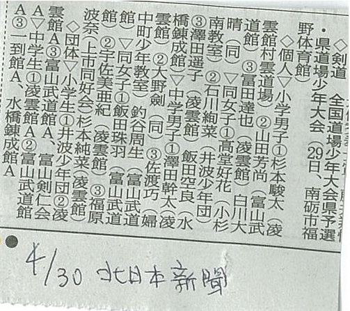 ![]() 小学生団体 2年ぶり3回目の優勝の井波剣道スポーツ少年団・・・堂々の胸をはっての、日本武道館出場 ![]() 小学生女子個人戦で、惜しくも準優勝の石川絢菜選手 北日本新聞記事(4月30日) |