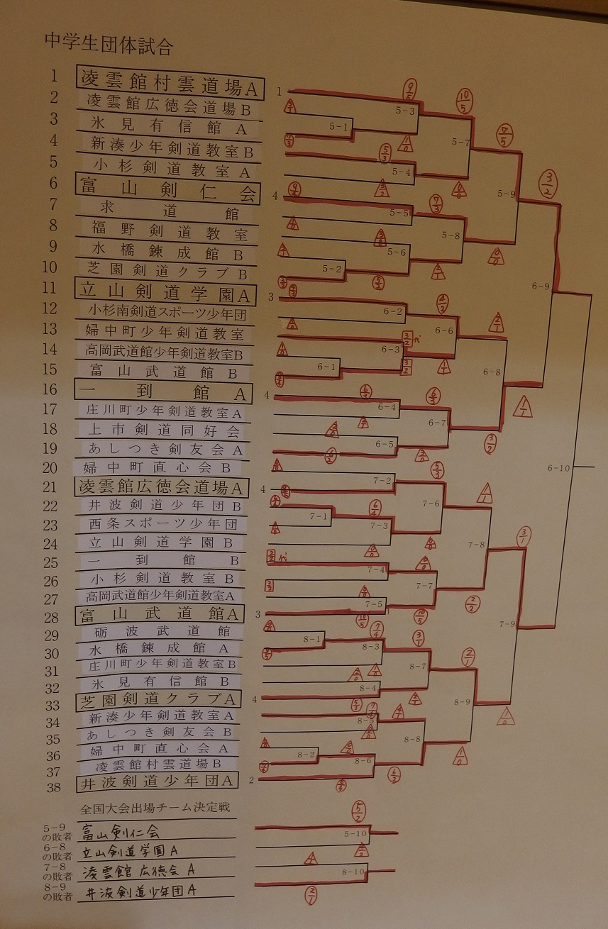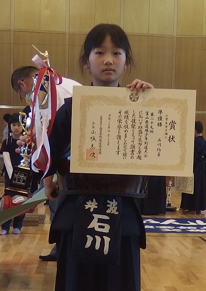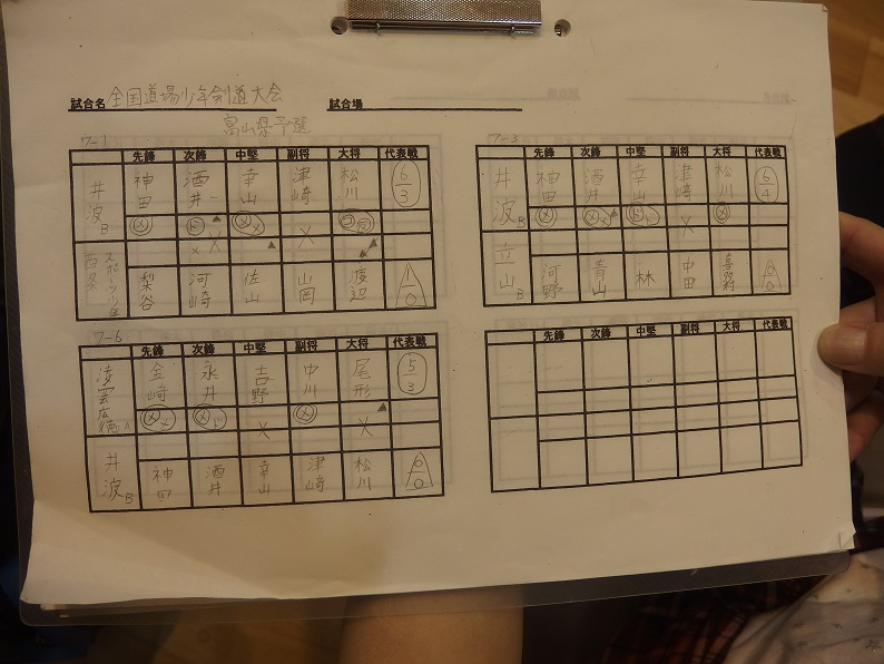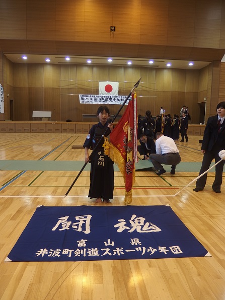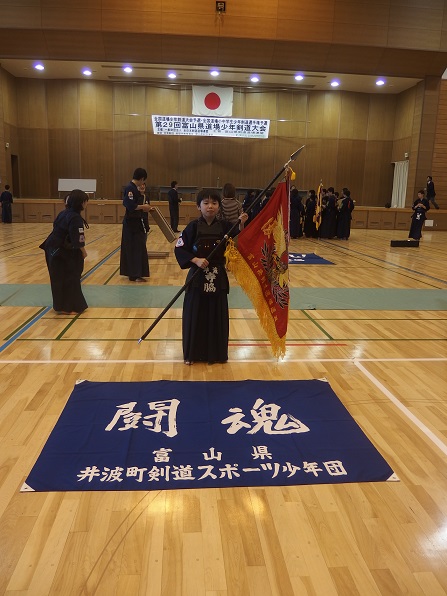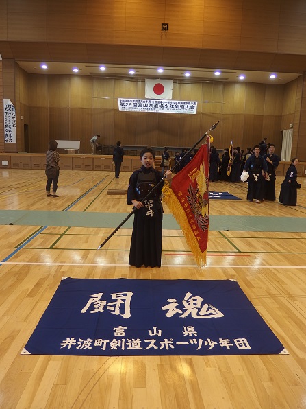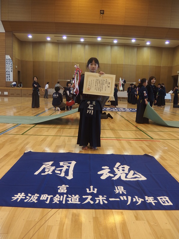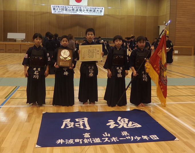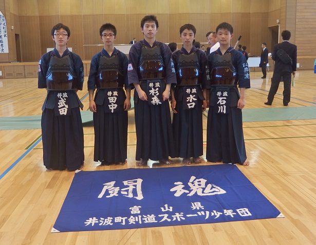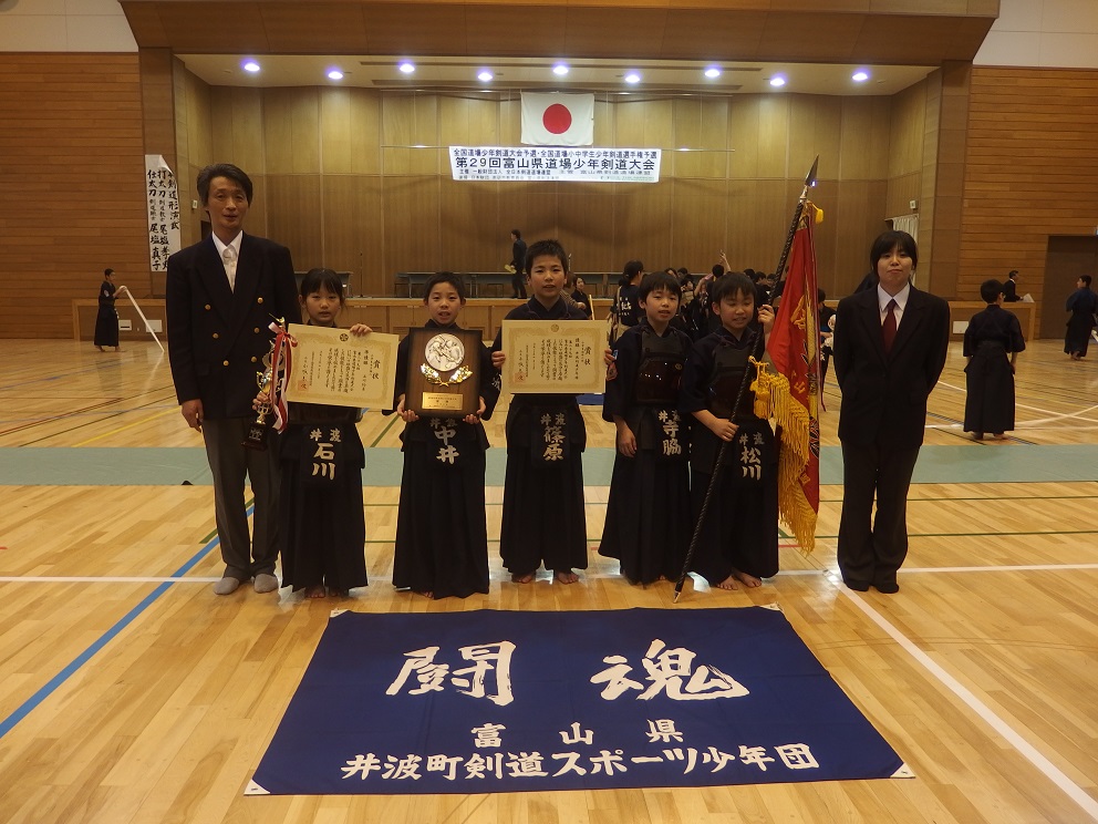 | *井波剣道スポ少の成績 (個人)小学生男子 中井将馬 3回戦進出(2勝)、篠原一星 2回戦進出(準優勝の山田〈富武〉に敗れる:1勝)、松川穂高 2回戦敗退、寺脇輝 1回戦敗退 女子 石川絢菜 準優勝(4勝:決勝で高堂〈小杉南〉に敗れる) 中学生男子 杉森佑紀 4回戦進出(3勝:ベスト16。準優勝の大野〈凌雲館〉に破れる)、石川凌太朗 4回戦進出(2勝:ベスト16)、 水口脩弥 3回戦進出(1勝)、武田将征 2回戦敗退 女子 松川瑞穂 2回戦進出(1勝)、田中真尋 1回戦敗退 (団体) 小学生 井波(石川絢・松川穂・寺脇・中井・篠原) 優勝・・・2年ぶり3回目 中学生 井波A(水口・田中・武田・石川凌・杉森) ベスト8進出するも、準々決勝で敗退、代表決定戦1回戦で勝ち、日本武道館出場決定 井波B(神田・酒井・幸山・津崎・松川瑞) 3回戦進出(2勝)するも、あと一歩及ばず |