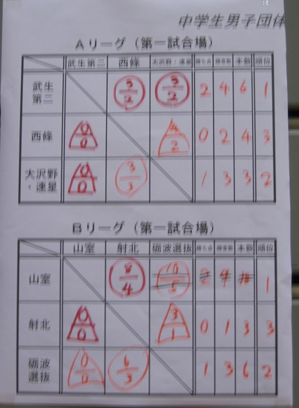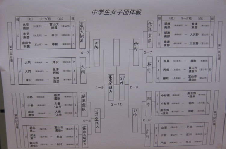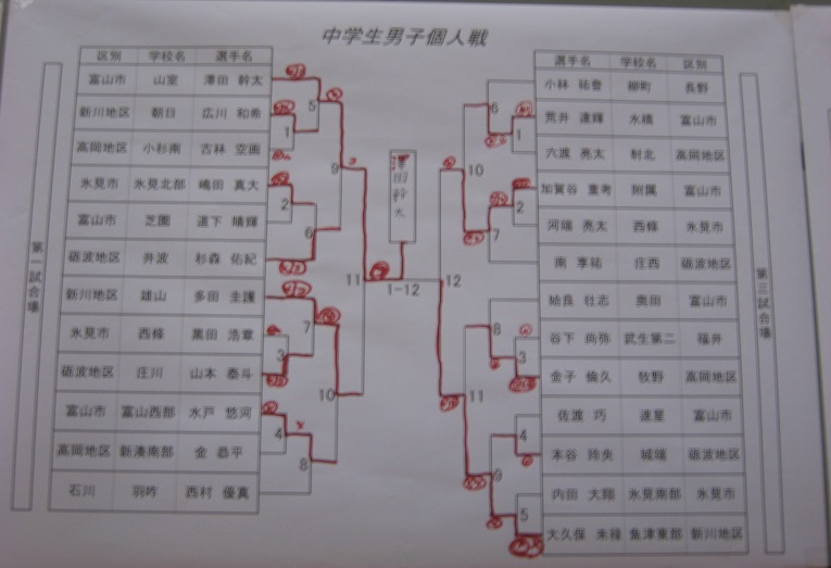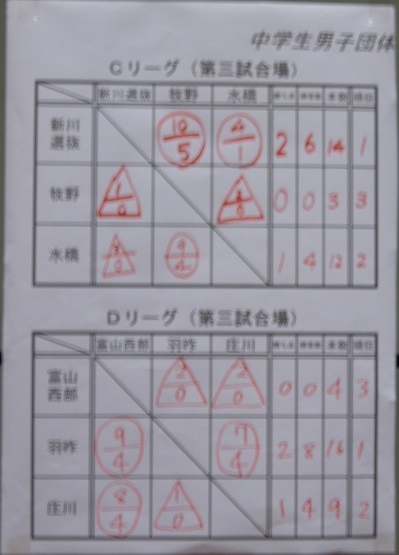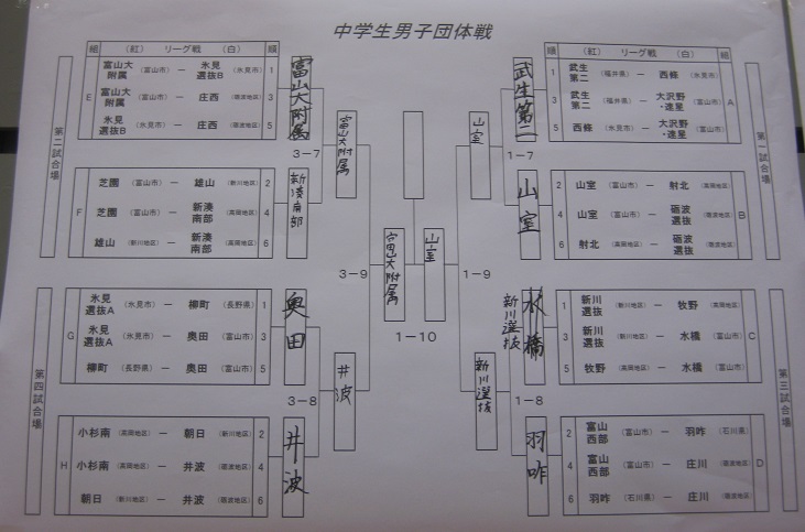 団体中学生男子 井波(水口・田中・武田・石川・杉森) 3位・・・・予選リーグ1位、決勝トーナメント準決勝で、富大附属に代表戦負け