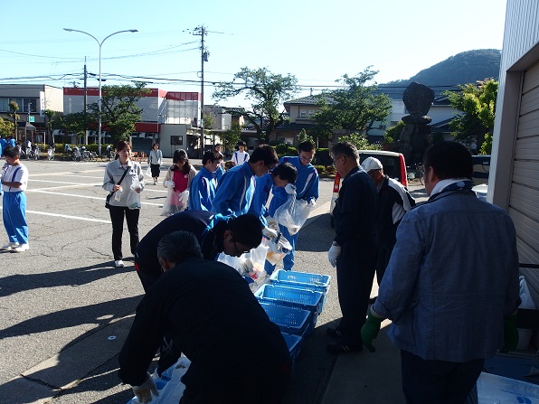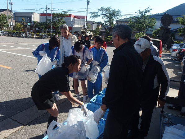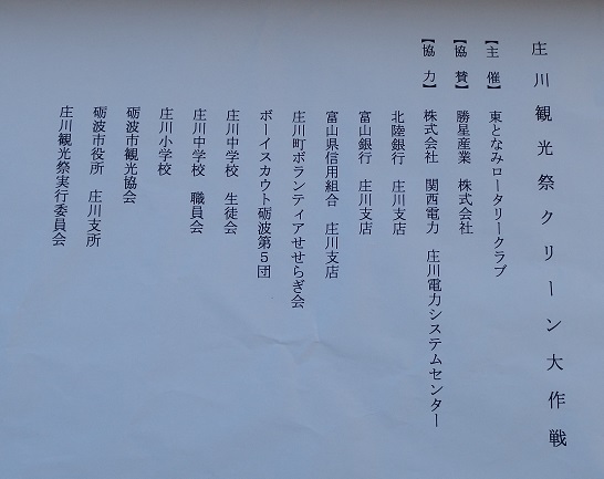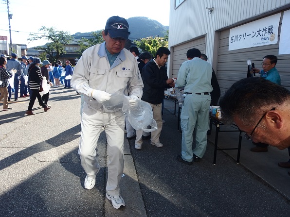 | 今年の庄川観光祭花火大会翌日の「庄川クリーン大作戦」は、形を変えて第10回目となります。 井波庄川ロータリークラブの創設以来、「ごみゼロ運動」として、開催されてきており、通算で36回目の清掃活動となります。 昨晩の花火大会は久し振りに雲一つない天候に恵まれ、観客も大変な大賑わいであったのですが、最近の傾向として、ごみは自分で持ち帰ろうという意識が根付いてきたようです。翌日のクリーン作戦では、あまりたくさんのゴミがありませんでした。しかし、飲食物のパックやタバコの吸い殻など、小さなゴミはまだまだ、落ちていたようです。 今年も、12協力団体、1協賛団体のご協力を得て、約170名の参加がありました。本当に有難うございました。 |
