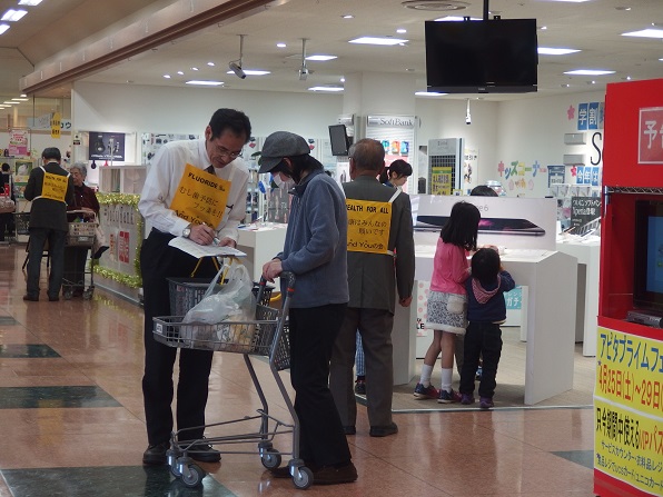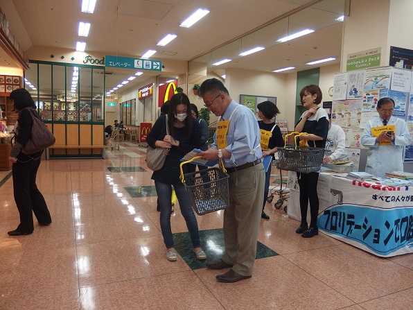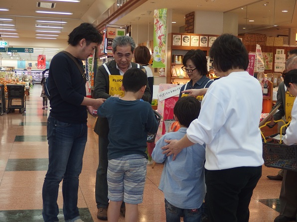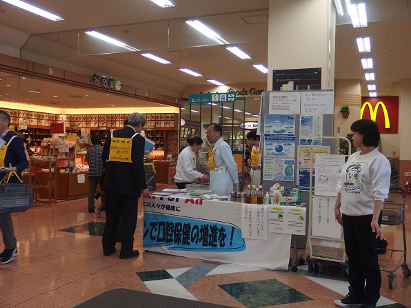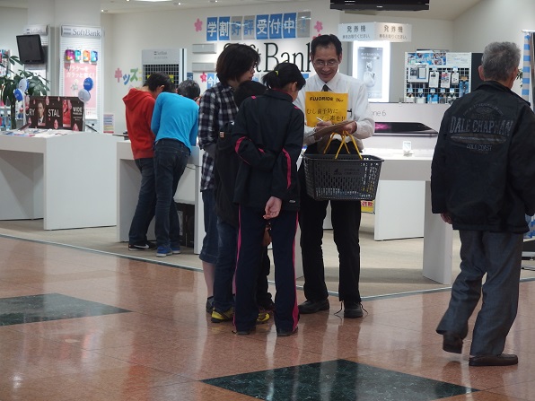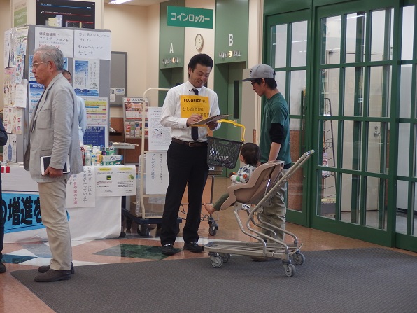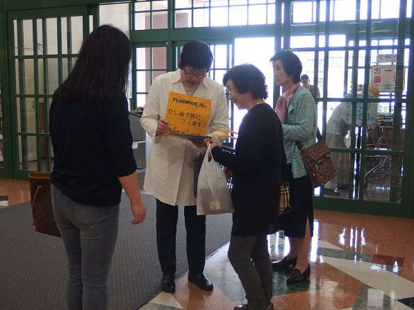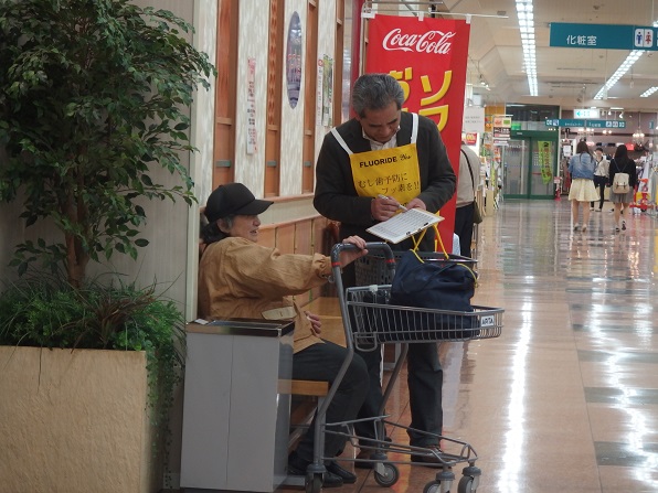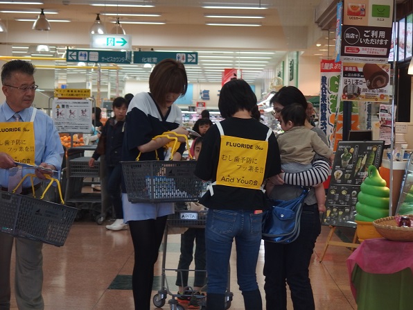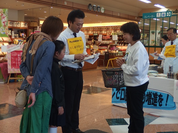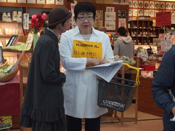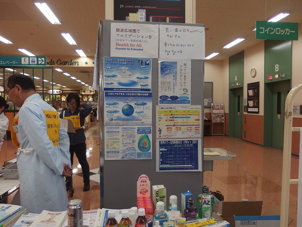 | 今年は、4月18日が土曜日となったため、久し振りにアピタ砺波店で、キャンペーンを実施しました。 And You(あゆ) の会関係者7名、東となみロータリークラブから11名の参加があり、5問の聞き取りアンケートを行いました。 協力して頂いた方は、176名となり、有難うございました。昨年のいい歯の日キャンペーンと大変よく似た結果がでました。フッ化物がむし歯予防があることを知っている人は、9割強、水道水フロリデーションについて、知っている人は2割弱、フッ素が食べ物、飲み物に入っていることを知っている人が6割弱、歯周病と糖尿病の関係を知っている人は5割強、歯周病と喫煙の関係を知っている人は、これも5割強という値でした。 この砺波地方では、幼稚園保育園(所)、小中学校のすべての施設が、フッ化物洗口を実施しています。県内や、一つの地区が全施設行っているところは、日本国内を見てもそんなに多くはありません。行ってみれば、日本での先進地区と言えます。しかしながら、最も効果的な手段であり、すべての住民に有効な水道水フロリデーションについては、知っている人が5人に1人と少ないです。メルボルンに行ってきましたが、多くの市民は、知っており、当然の方法と思っていました。これから、少しづつ啓発普及をしていかねばなりません。 |