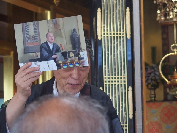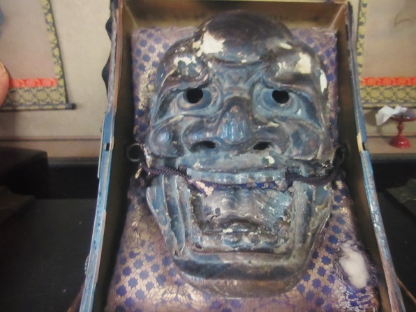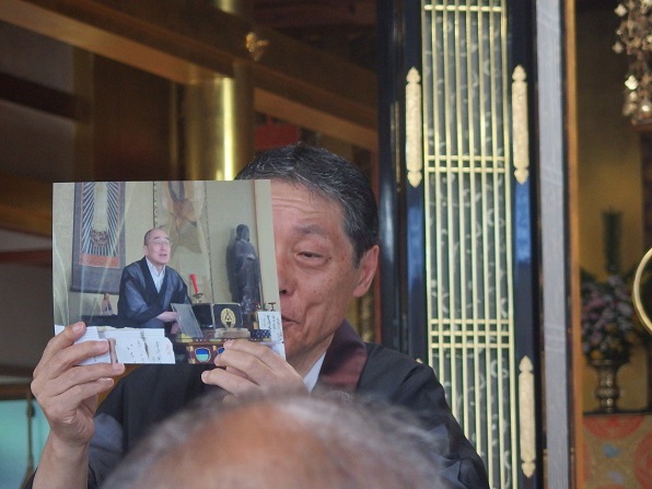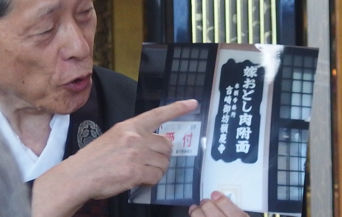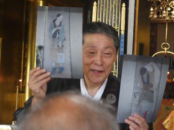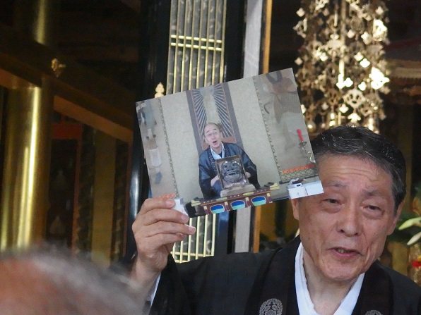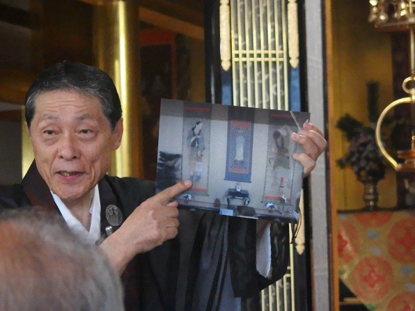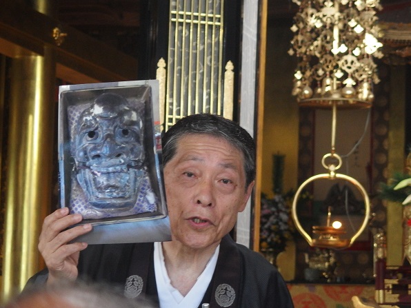 お面の伝わるお寺には、嫁・阿弥陀如来・鬼の面のおばばが祀ってあります。 説明をされるご住職