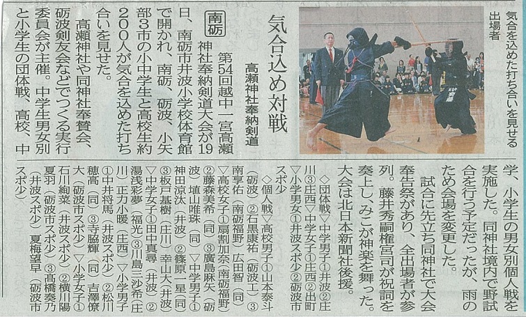 *試合形式 ◎団体戦 ・・・勝者が決しないときは、代表者試合を行う 1 中学男子トーナメント 1校5名 補欠2名 時間3分 延長なし 2 中学女子トーナメント 1校5名 補欠2名 時間3分 延長なし 3 小学男女トーナメント 1チーム5名 補欠2名 時間2分 延長なし ◎個人戦 ・・・中高校生は2年生以下 1 高校男子トーナメント 1校5名以内 時間3分 2 高校女子 〃 〃 〃 3 中学男子 〃 1校3名以内 〃 4 中学女子 〃 〃 〃 5 小学男子 〃 1チーム3名以内 時間2分 6 小学女子 〃 〃 〃 (東となみロータリークラブより寄贈の優勝杯・次勝杯) ◎規定 1 参加選手 中学・高校は二年生以下 2 全員運動靴着用(足袋は禁止) ※持参なき時は出場停止 平成28年度(第54回大会) 参加チーム 小学生(9チーム57名):庄川剣道スポーツ少年団、B&G砺波剣道スポーツ少年団、砺波市剣道スポーツ少年団、小矢部市剣道教室、津沢剣道スポーツ少年団、城端剣道スポーツ少年団、福野剣道スポーツ少年団、晴武館、井波剣道スポーツ少年団 中学生男子(9校47名):福野中、庄川中、井波中、津沢中、出町中、庄西中、城端中、石動中、般若中 中学生女子(6校25名):庄川中、津沢中、井波中、出町中、庄西中、福光中 高校生男子(3校15名):砺波高校、福野高校、砺波工業高校 高校女子(2校10名):福野高校、砺波高校 |