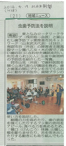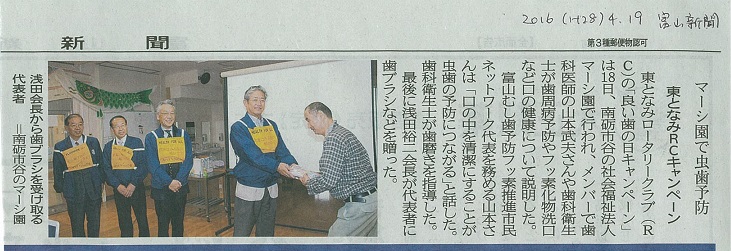(4月18日)、富山むし歯予防フッ素推進市民ネットワーク【And You(あゆ) の会】と東となみロータリークラブは、共催で「良い歯の日キャンペーン2016」を開催しました。