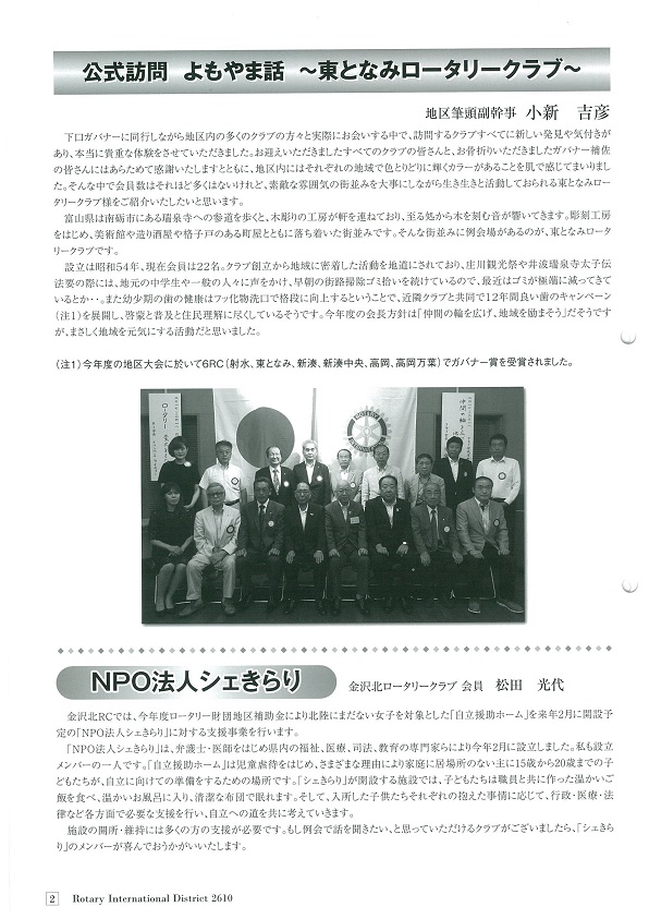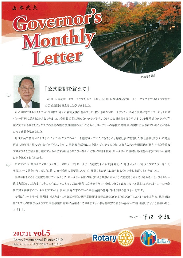 2017年11月 2610地区ガバナーマンスリーレポート 2頁に、東となみRCの公式訪問の紹介記事と、「ガバナー賞」受賞の紹介