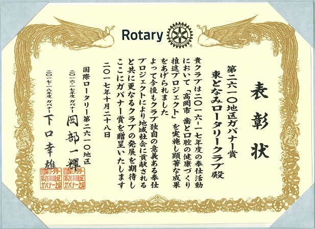 2017-2018年度国際ロータリー第2610地区 地区大会で「ガバナー賞」受賞