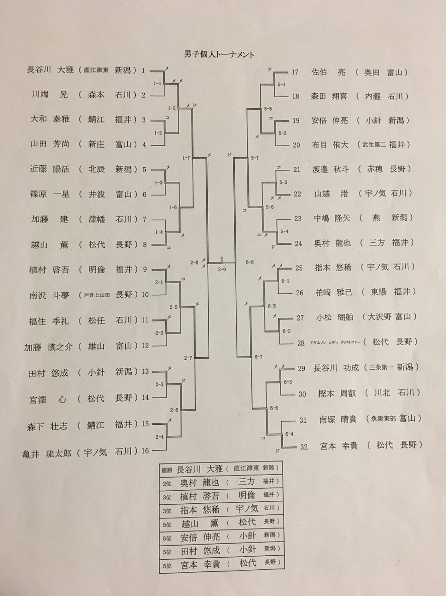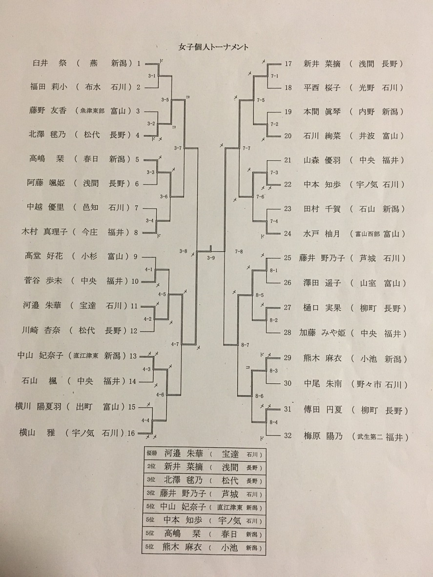 男子個人 篠原一星 1回戦敗退 女子個人 石川絢菜 2回戦進出(1勝:2回戦で準優勝の荒井菜摘:浅間中・長野に惜敗)