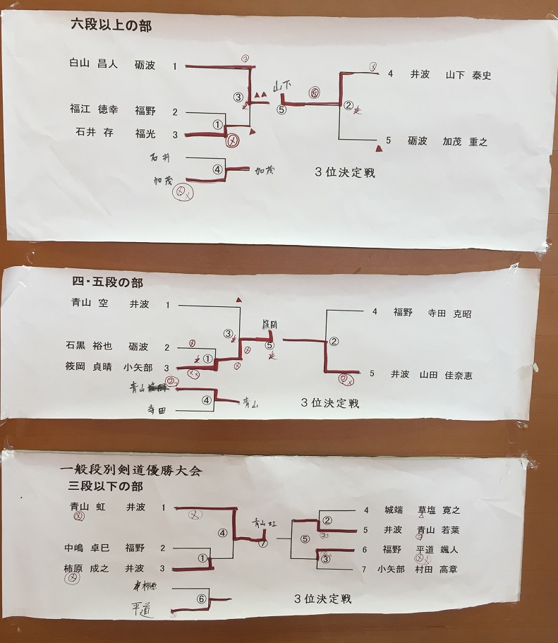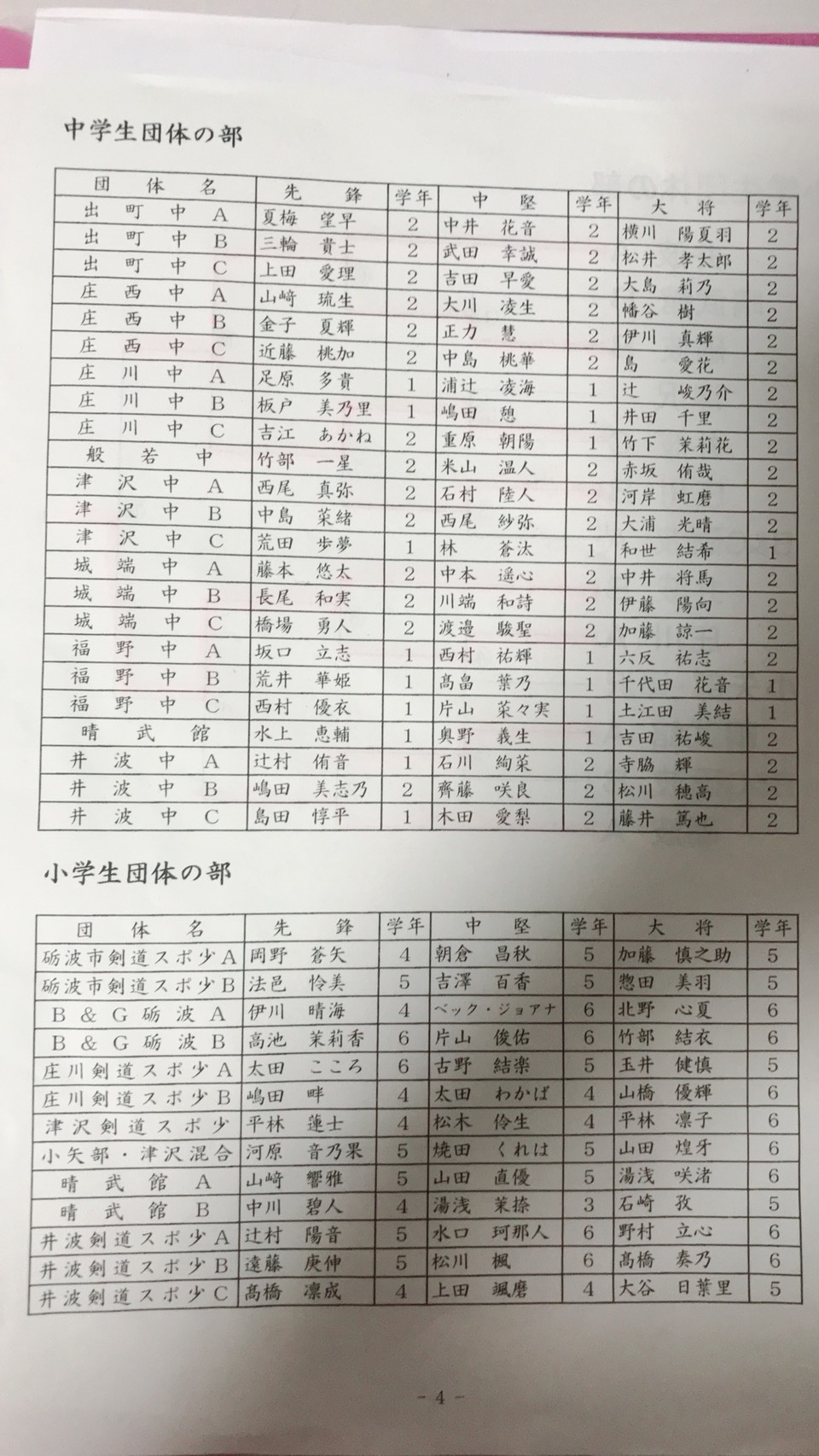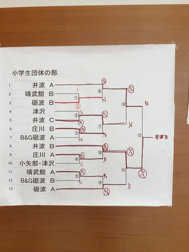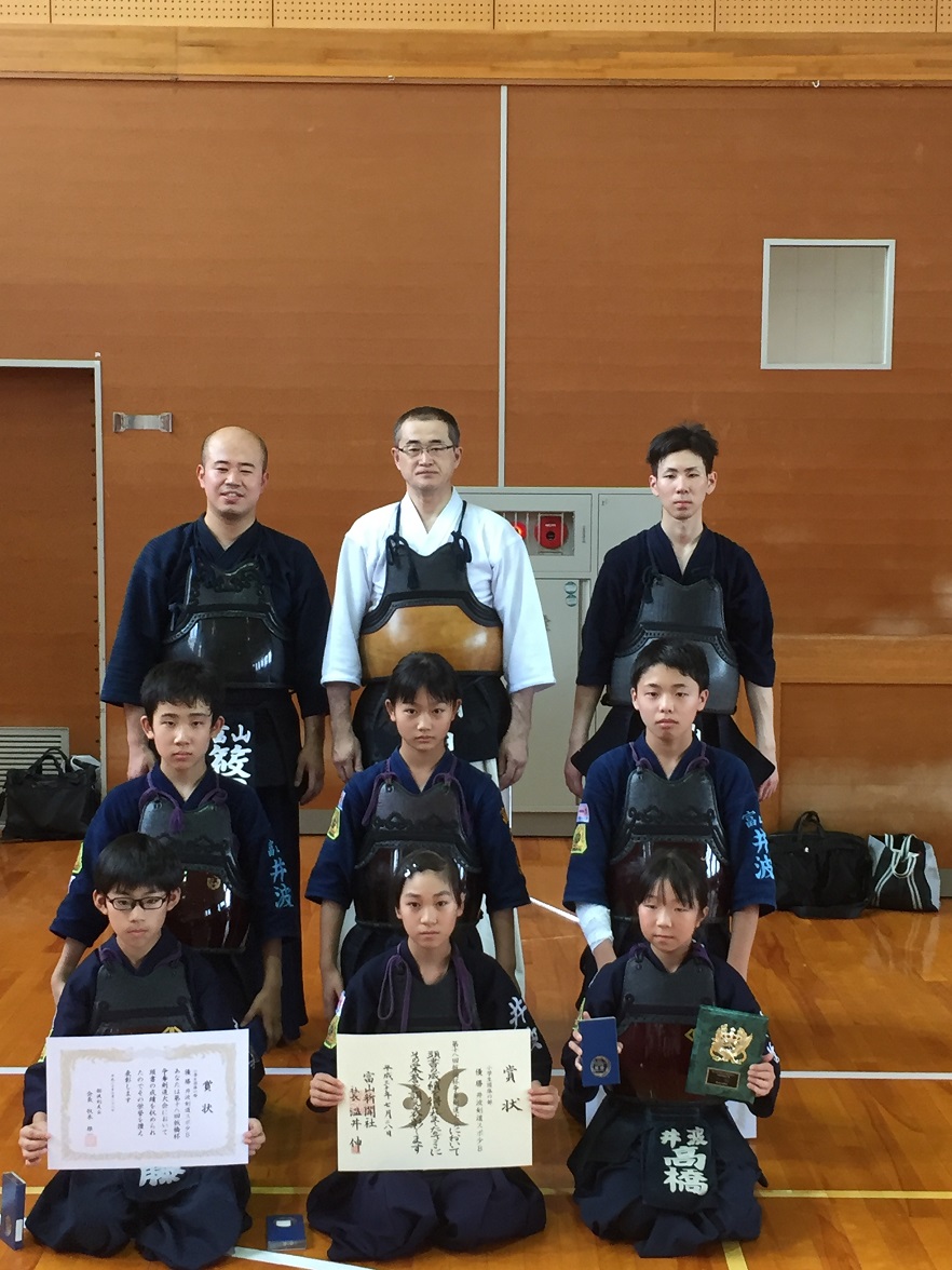 小学生団体の部 井波B(遠藤・松川・高橋奏) 優勝、 井波A(辻村・水口・野村) 次勝、 井波C(高橋凛・上田・大谷) 3位