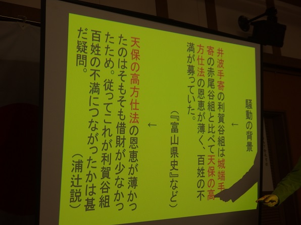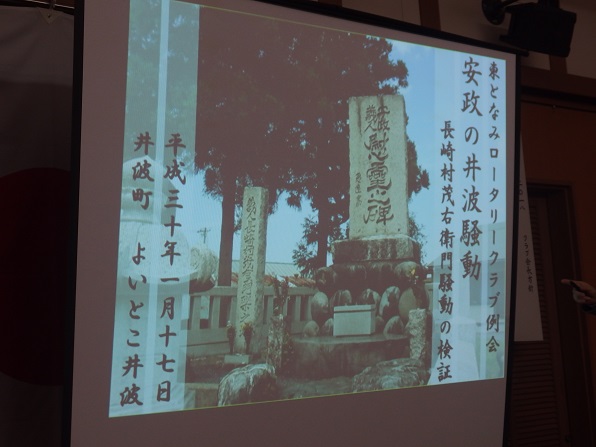 | (卓話要旨) 東となみRCの卓話に「よいとこ井波」に呼ばれましたが、安政5年(1858年)7月にこの井波で起こった騒動の場所の一つにまさにこの場所があります。井波騒動とは、安政5年(1858年)幕末期に、米価高騰に怒った農民が井波町の米商を襲撃したもので、利賀谷の肝煎・組合頭など24人が投獄され、15人が牢死しました。長崎村茂兵衛倅茂右衛門が首謀者として、磔処刑されました。この事件は、加賀藩でも何カ所かで起きた騒動です。利賀谷は、生糸・和紙を生産し、米などを供給されていた経緯もあり、米不足が引き金になり、井波の米屋を襲撃、4カ所の商家の打ち毀しを行いました。当初は口伝で残り、現在は、「井波町史」などにも記録があります。打ち毀しの場所が、まさにこの例会場でした。 |