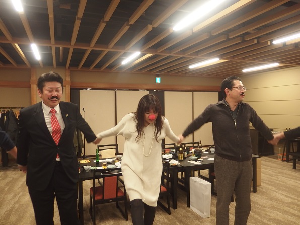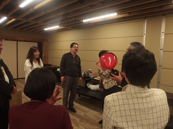お楽しみ② 風船割りゲーム・・・畠中親睦委員の指定の言葉を言い、隣に渡す(止まると、風船が破裂)