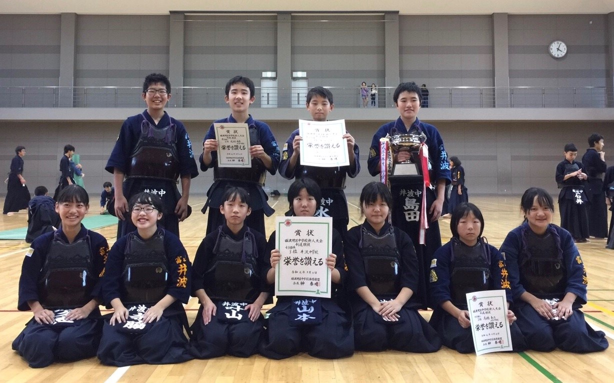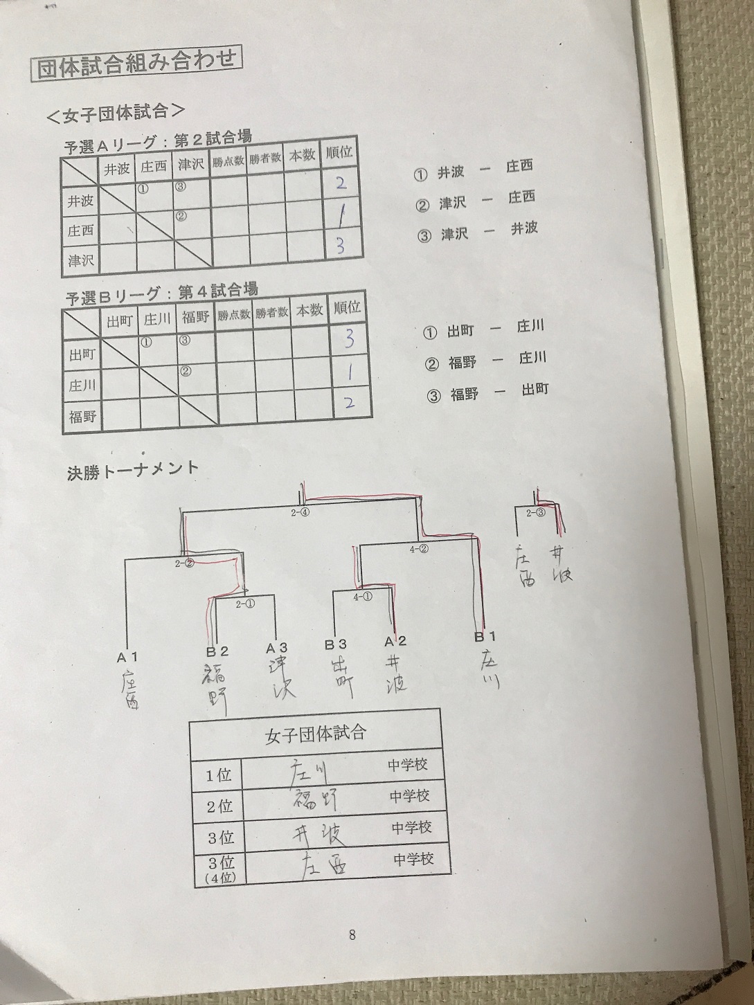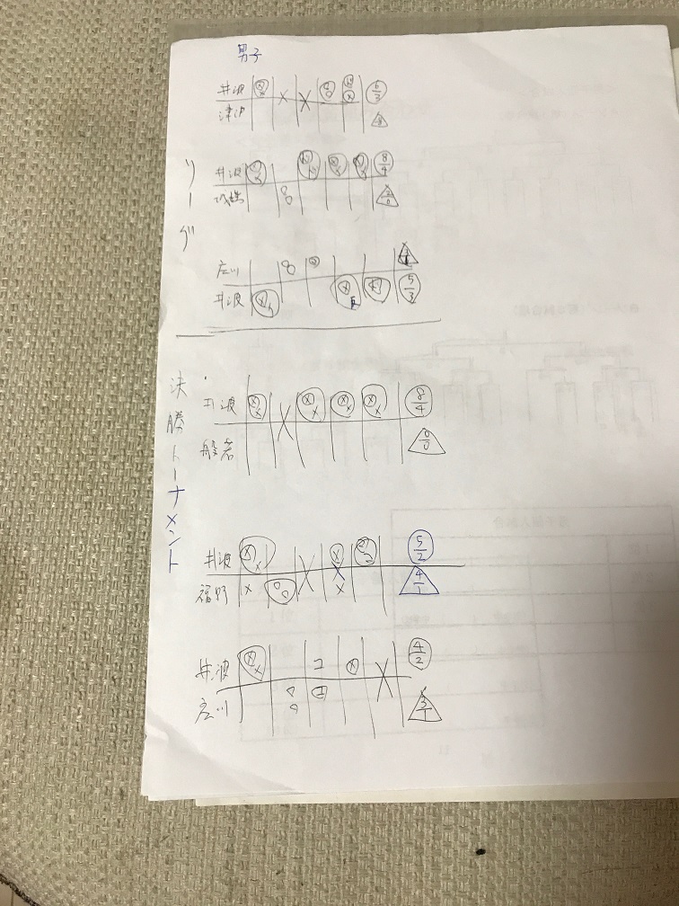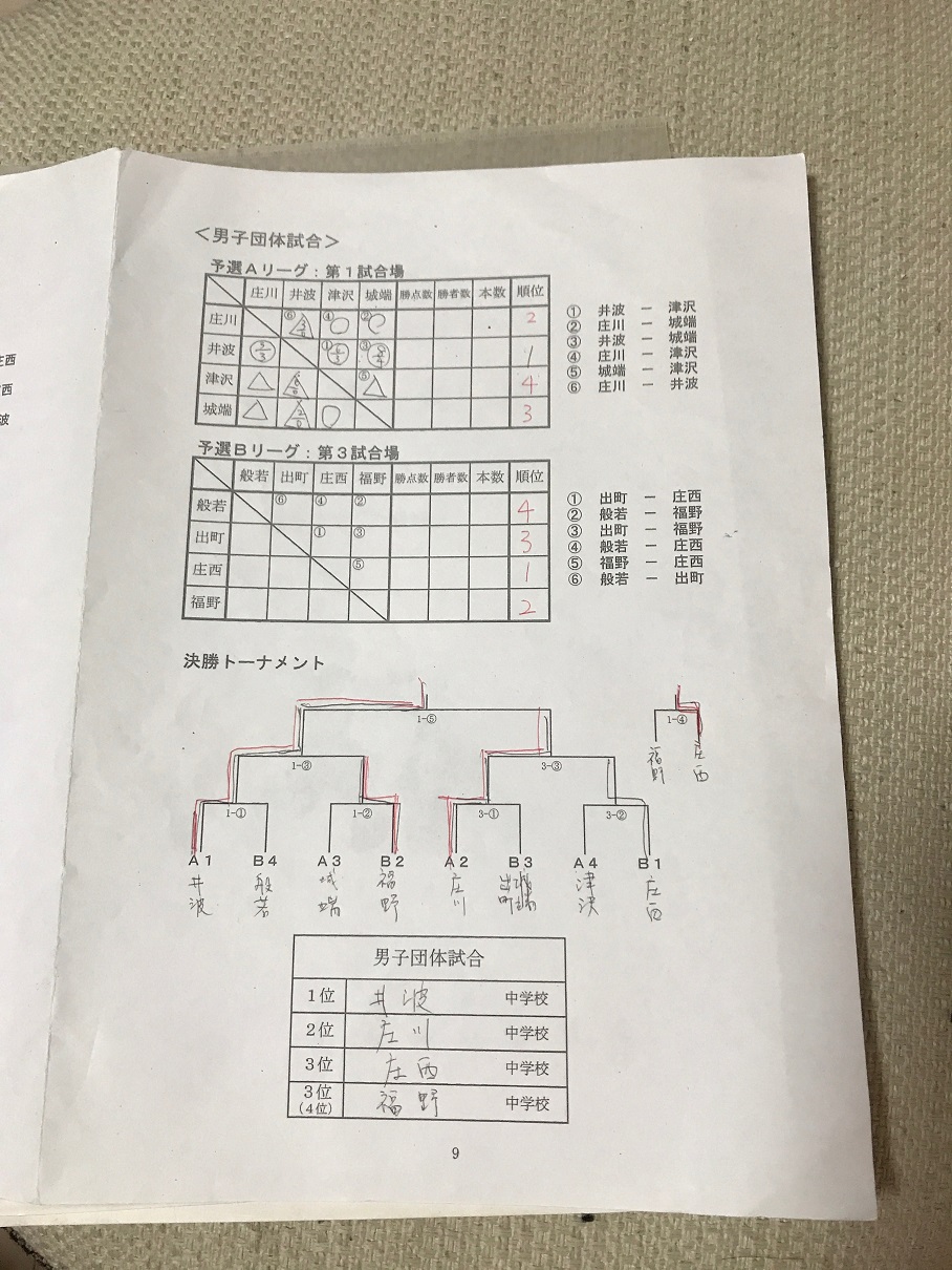 男子団体 井波中(水口・ー・島田・野村・辻村) 予選リーグ1位で、決勝トーナメントへ。4人チームで、優勝