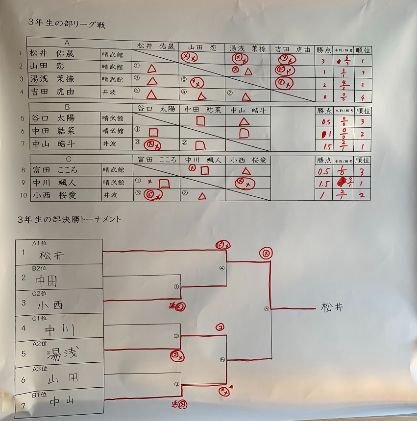 小学3年 松井(晴武館)優勝、中山皓人 次勝、小西桜愛 3位、吉田虎由 予選リーグ敗退