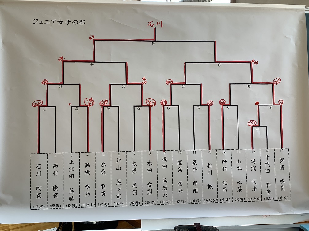 ジュニア女子 石川絢菜 優勝、齊藤咲良 次勝、木田愛梨・嶋田美志乃 3位、高橋奏乃・高桑羽奏・松川楓・野村妃希 ベスト8
