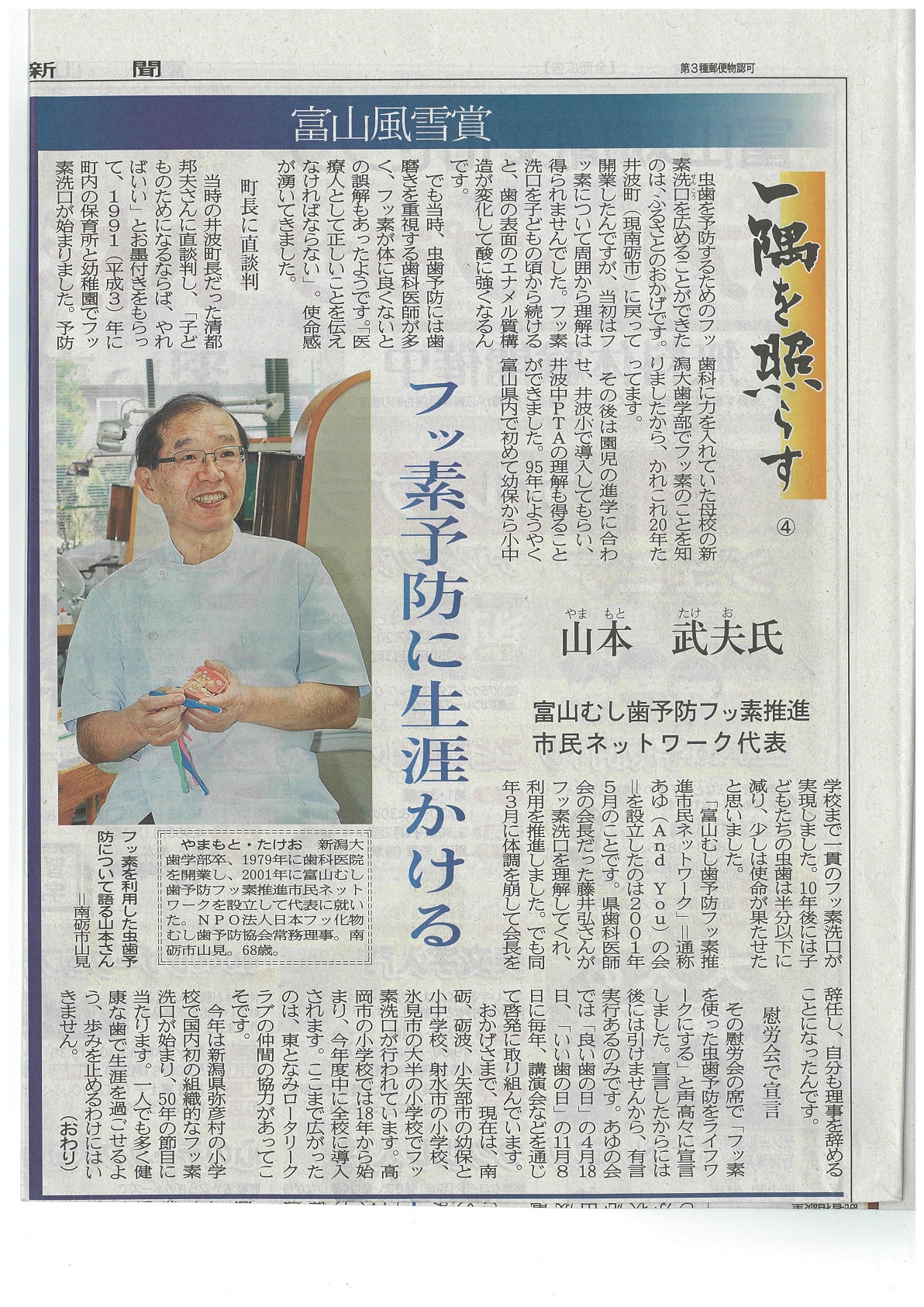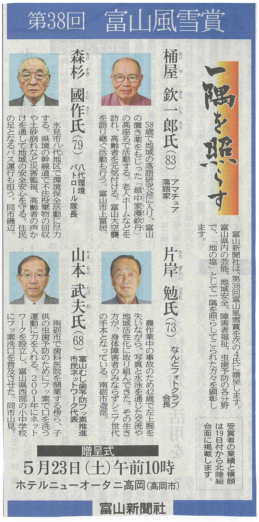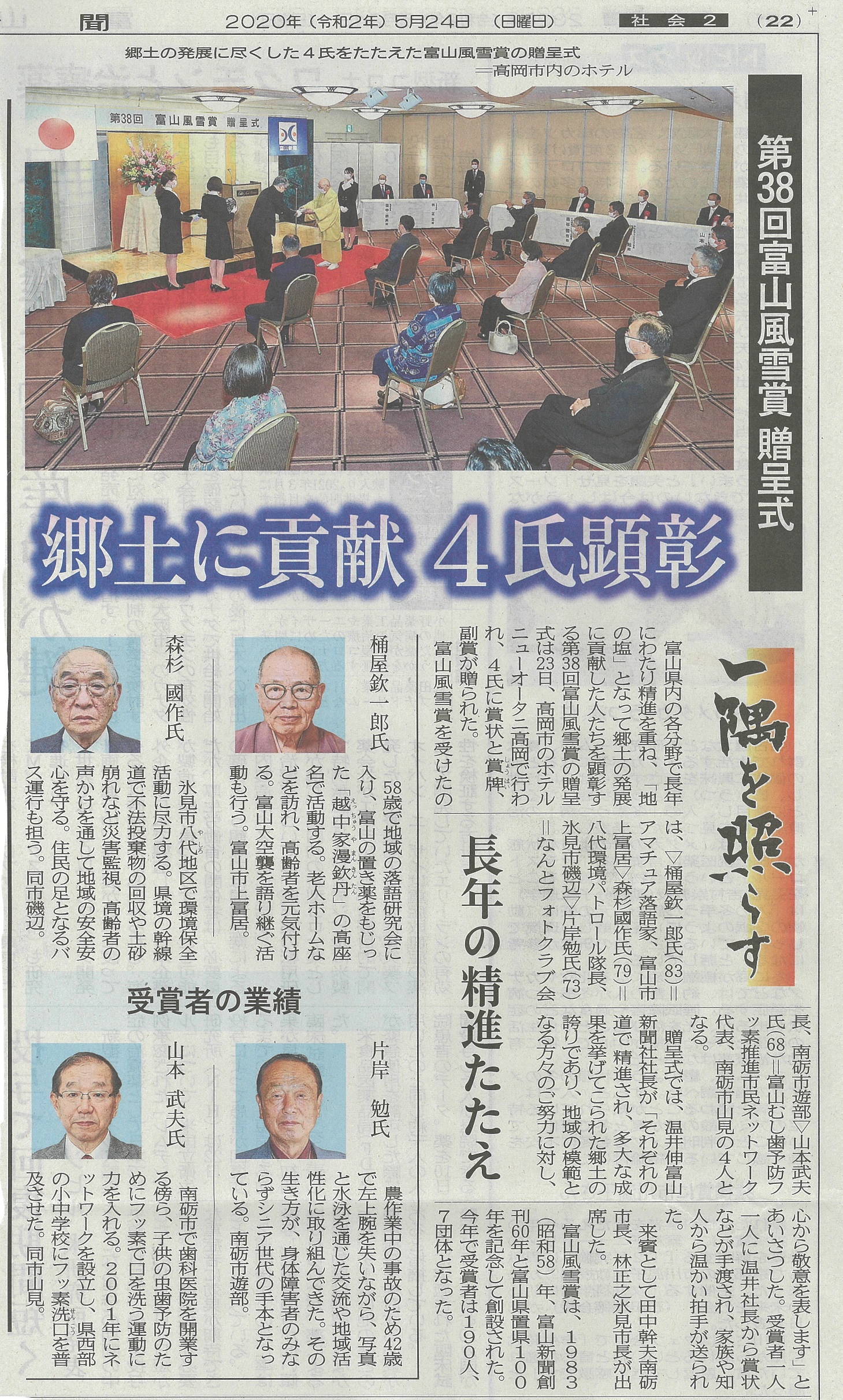 第38回富山風雪賞 (令和2年度) この度、富山新聞創刊60年と富山置県100年を記念して創設された「富山風雪賞」受賞いたしました。 ここまで、大変ご理解と御支援を賜りました、皆様に深甚より、感謝申し上げます。 ここに、富山新聞社の関連記事を掲載させて頂きます。 (令和2年5月24日、山本武夫)