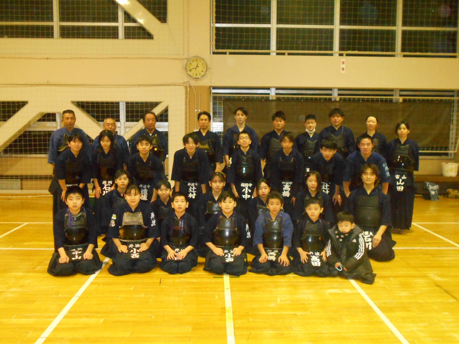 2021-2022年 井波剣友会年越し稽古 12月31日午後10時半~ 南砺市山野交流センター(旧公民館)・・・スポ少:小学6年以上、中学生 昨年は、コロナの影響で中止、2年ぶりの年越し稽古です。 恒例の最後の集合写真です・・・今年は都合により、管理者が欠席しました 稽古風景・・・コロナの影響で、稽古風景も少し変わりました(マスクなど、3密に気を付けて実施されました)