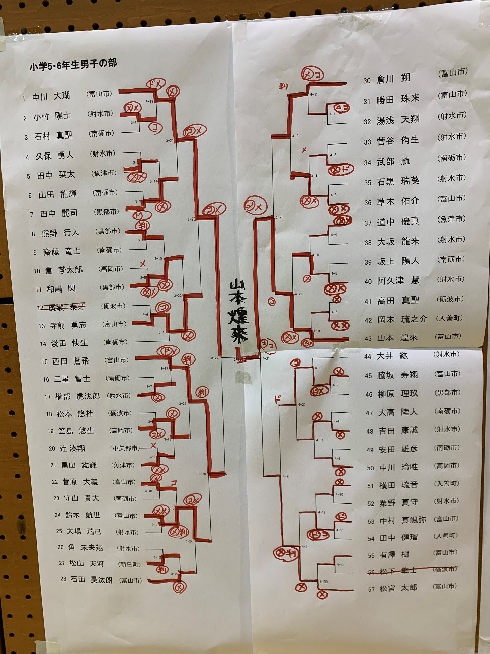 5・6年男子の部 武部航 2回戦進出(1勝)、 *南砺市勢:浅田 2回戦敗退、 齋藤・石村・守山・坂上・大高・安田 1回戦敗退