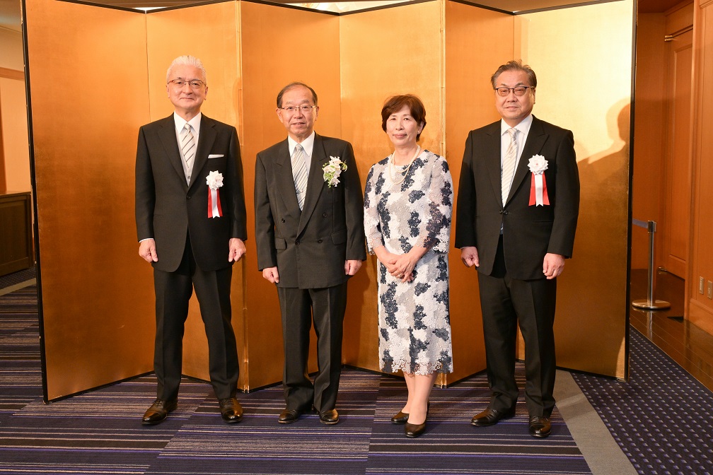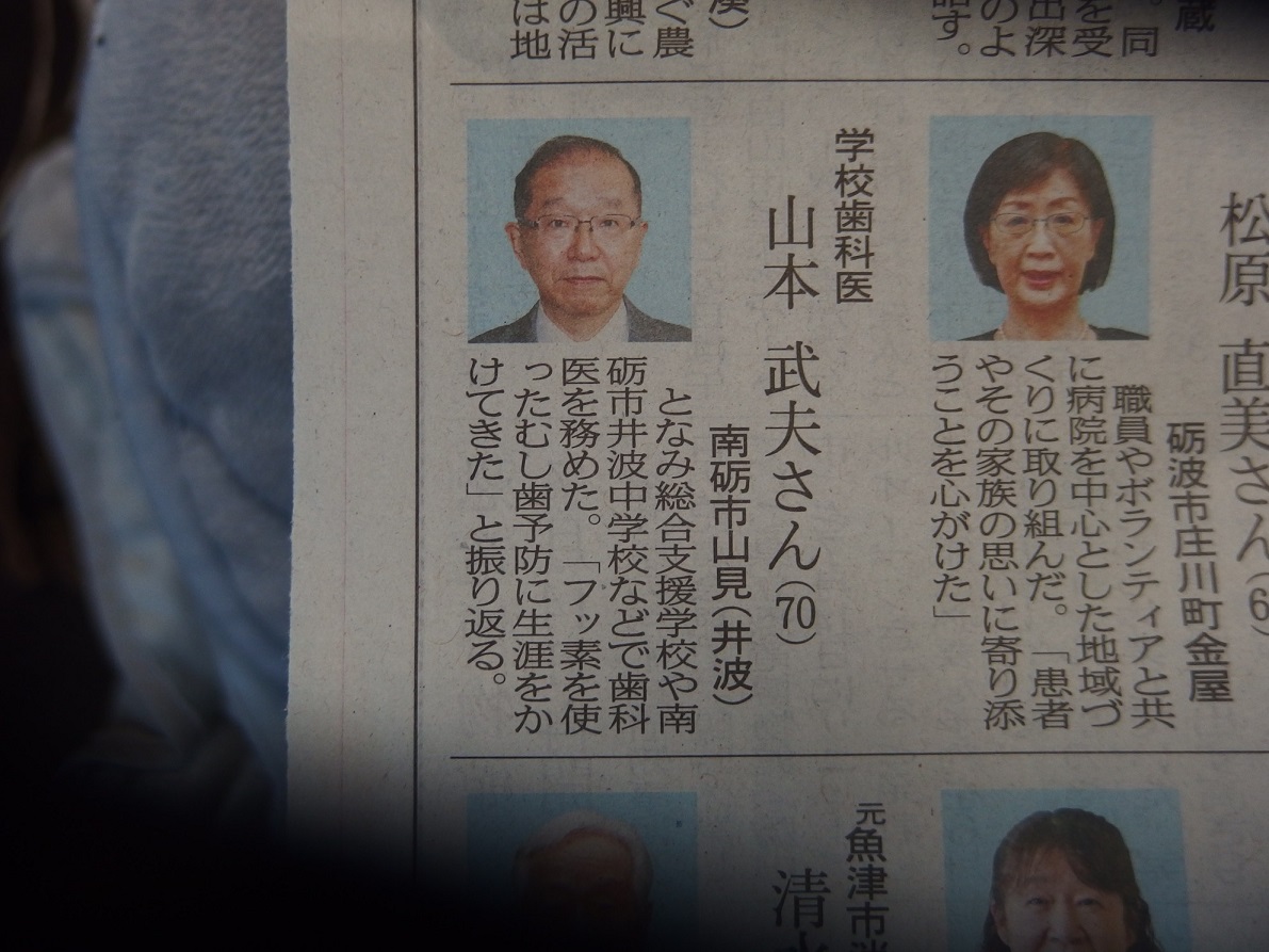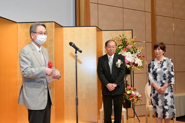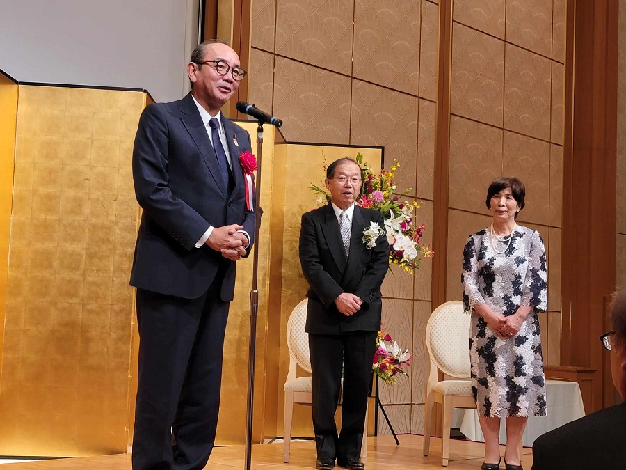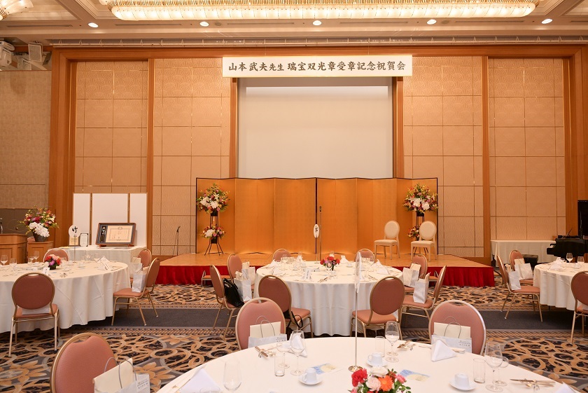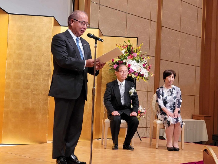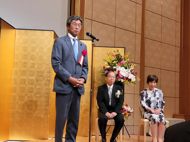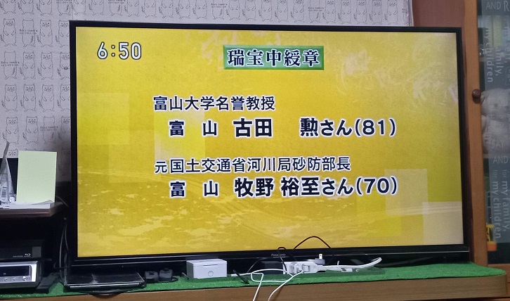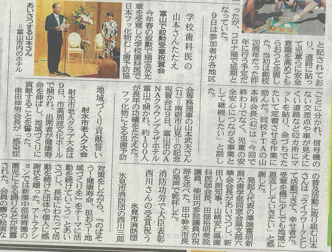 4/29新聞等で発表があり、5/12東京の国立大劇場にて、文部科学省の伝達式がありました。その際、敬愛する古田勲富山大学名誉教授(瑞宝中綬章受章)と偶然一緒になり、お互いに撮影をしあいました。その後、皇居に移動し、天皇陛下の拝謁を頂きました。 9/9、新潟大学歯学部同窓会富山県支部(六華会)と南砺市歯科医師会合同の叙勲祝賀会を、ANAクラウンプラザホテル富山にて、開催して頂きました。
