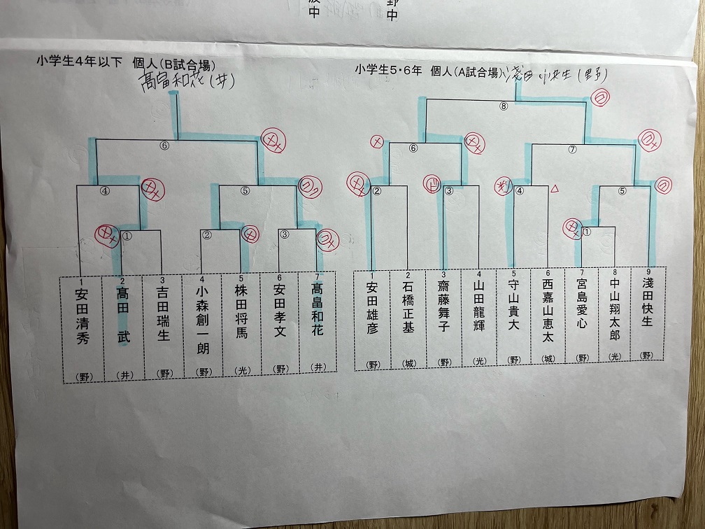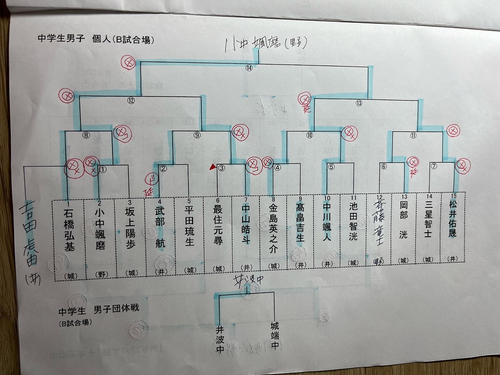 中学生男子個人 小中颯磨(福野) 優勝、中川颯人 次勝、松井祐晟・中山皓人 3位、武部航 ベスト8、吉田虎由・高畠吉生 1回戦敗退