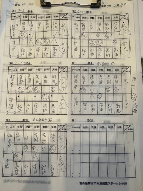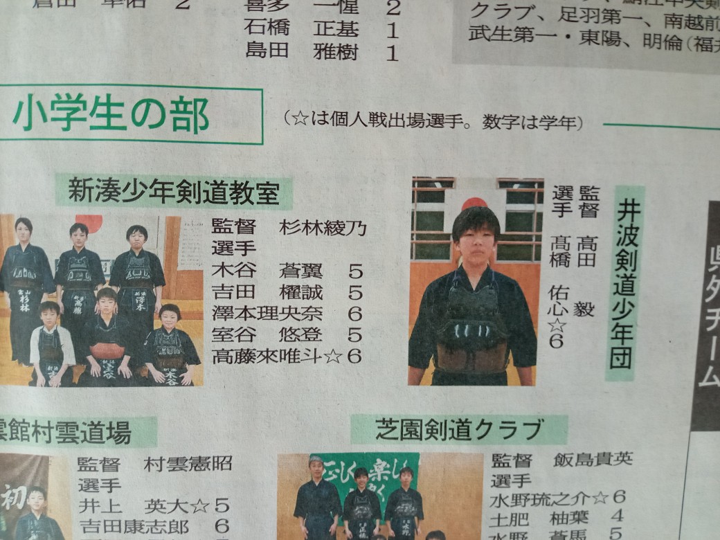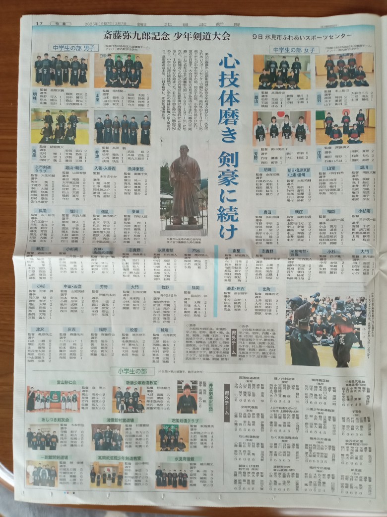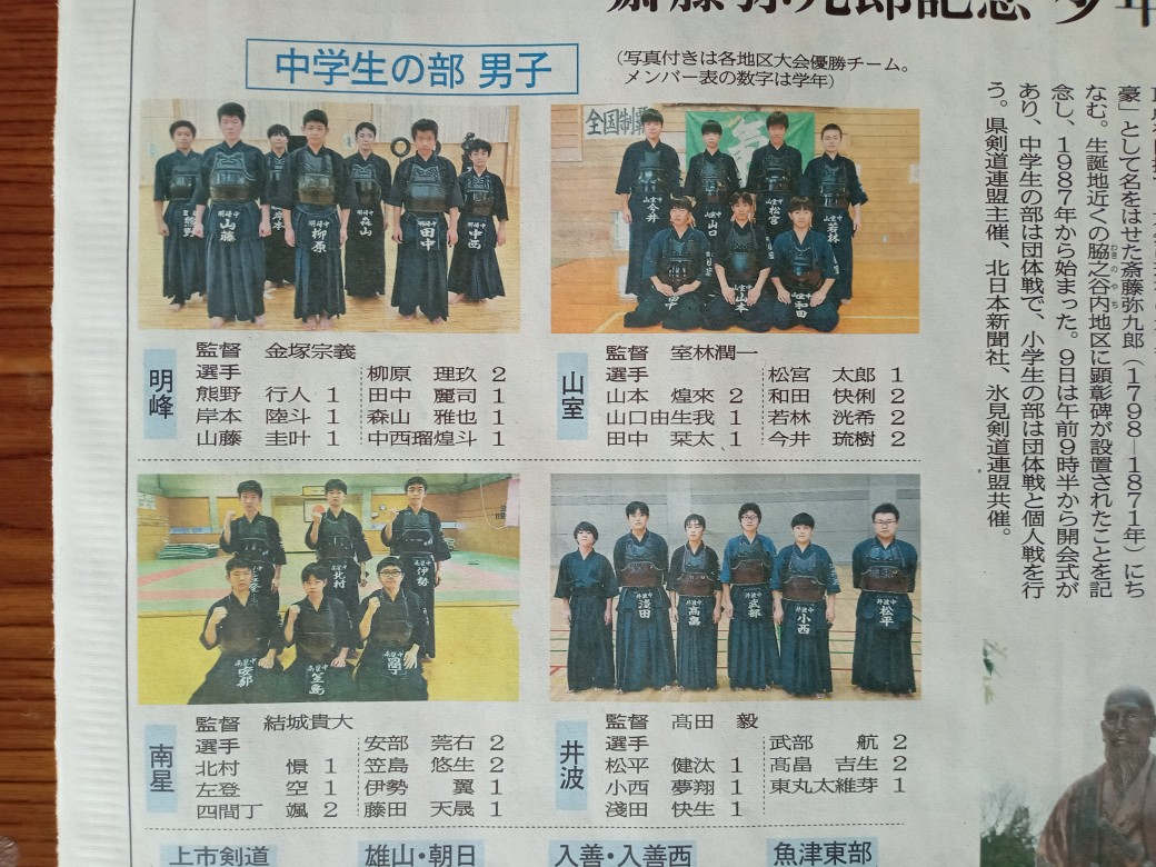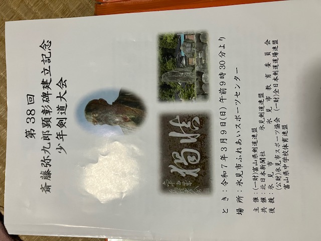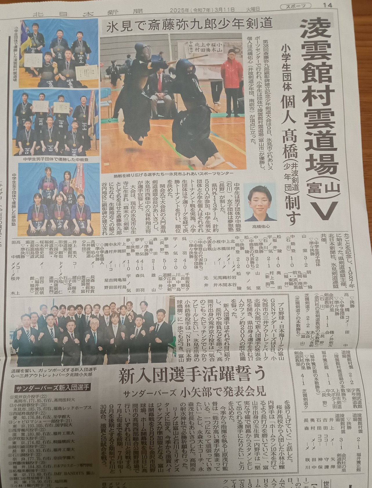 第38回斉藤弥九郎顕彰碑建立記念少年剣道大会 令和7年3月9日 氷見市ふれあいスポーツセンター 北日本新聞社主催、結果掲載記事 小学生個人 高橋佑心 優勝 中学生男子団体 井波中(松平・小西・浅田・武部・高畠) 3回戦敗退(2勝:ベスト16) *北日本新聞掲載記事(大会案内・選手名簿) 父兄記録より *前日(3/8)稽古会の記録