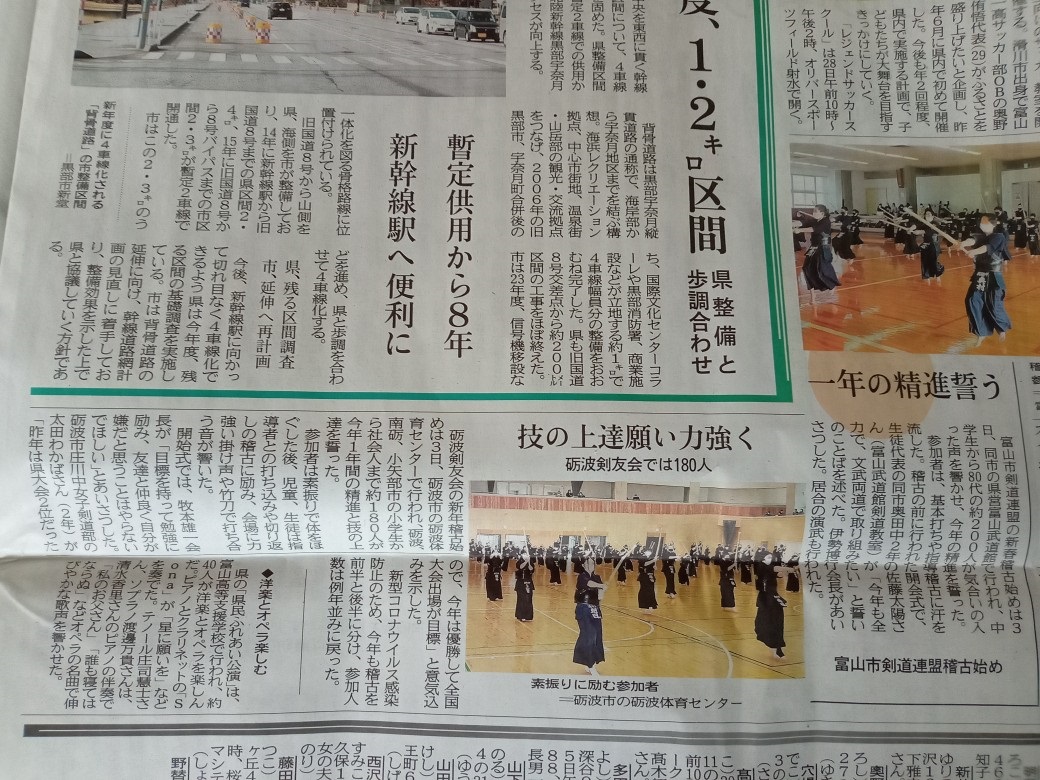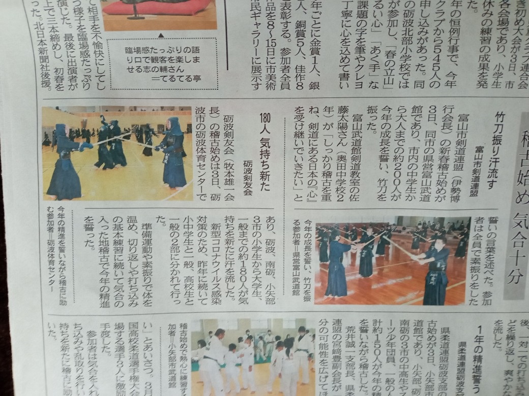 1年ぶりの顔合わせ、全員集合(今年は、山田修弘先生に撮影をお願いしました) 稽古の様子 【追加】2023年1月3日、砺波剣友会主催の、初稽古の記事が新聞2社の掲載されていました。紹介します。