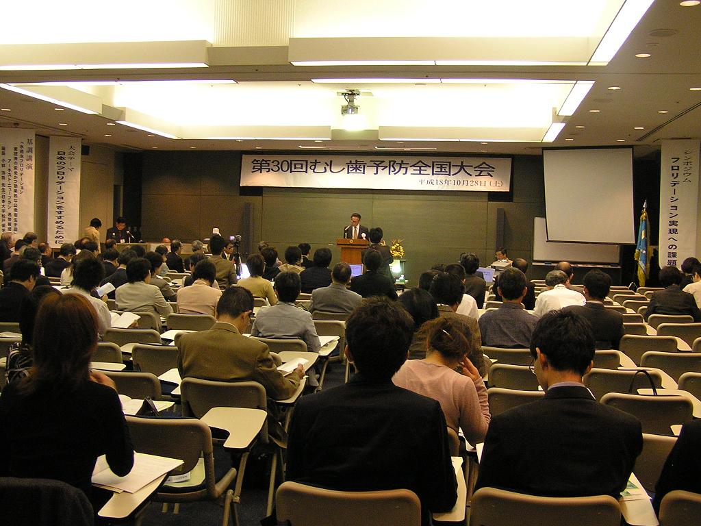 | 2006年(平成18年)10月28日(土)、東京水道橋、血脇記念ホールにて、上記大会が開催されました。以下、大会の様子を簡単に記載いたします。翌29日(日)NPO法人日F会議総会終了後、講師のニューブラン先生を助言者に、「フロリデーション研修会」が同ホールで開催されました。 むし歯予防全国大会は、取材もあり歯科系新聞に掲載されました。この頁末に内容を記載しております。 この大会のまとめは、田浦先生の報告に、詳細が載せてあります。 日時:2006年10月28日(土曜日) 13:00〜17:30 場所:血脇記念ホール 東京都千代田区三崎町2-9-1 東京歯科大学水道橋病院2階 主催:NPO法人日本むし歯予防フッ素推進会議(略称 NPO日F会議) 後援:日本歯科医師会、8020推進財団、日本学校歯科医会、日本歯科衛生士会、日本口腔衛生学会 協賛:日本歯磨工業会 ![]() 13:00〜 第30回記念式典 スナップ写真(式典〜懇親会)