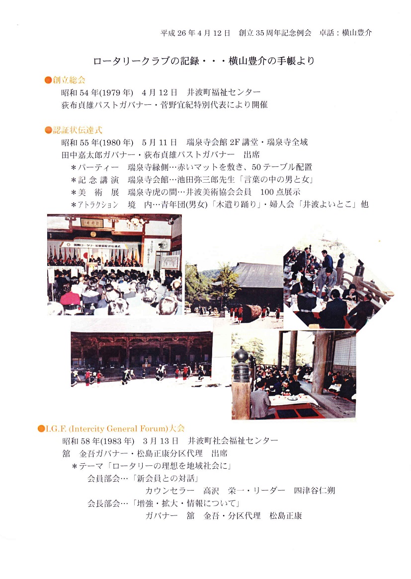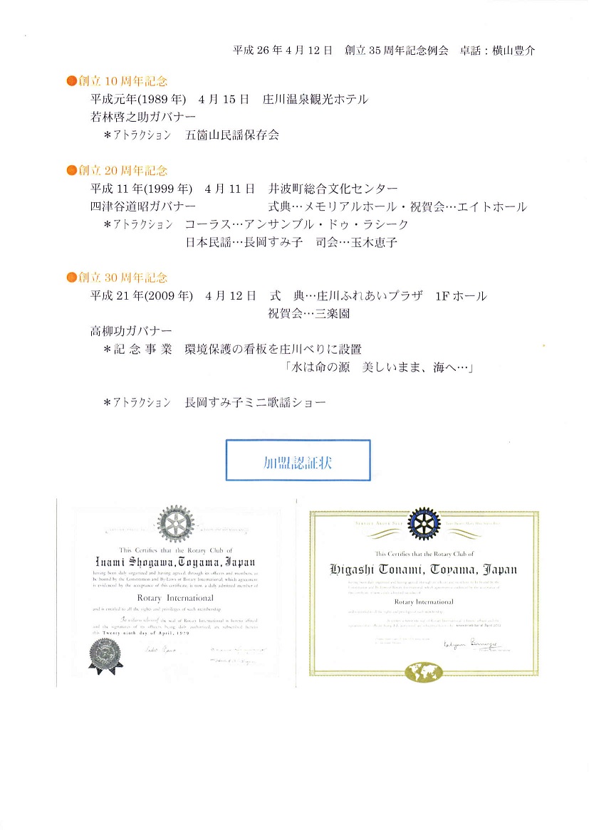 2013-2014年度 東となみロータリークラブ 創立35周年記念例会・観桜会 写真集 平成26年(2014年)4月12日(土) 創立35周年記念例会 午後5時 「よいとこ井波」