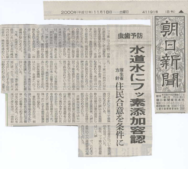 | (よく読もう,この裏を・・・) この記事が出たときは,やったという気持ちであった。 3大紙で,朝日がスクープした形であったが、よくよく,推測すると,朝日新聞は,フッ素研究会が19日に行う反対派の集会の情報をキャッチしていて,たまたまこの情報を得て、書いたものであろう。なぜなら、この記事の中にある、むし歯予防や安全性の議論が起こりそうだと決め付けている点が,物語っている。 また,この記事にも,3文週刊誌がごとく、事実無根を検証なしに書いて,厚生省当局を混乱させた犯罪的行為が一つある。 「厚生省は17日までに,水道水へのフッ素添加を容認する方針を決め,関係自治体などに伝えた。」という部分である。 当日の厚生委員会質疑記録のどこを取っても,それが出ていないし,厚生省に尋ねてもそう答えるはずがない。恐らく,フッ素研究会から情報を得て書いたものと考えられる。 この記事から,もう1つ読み取れるには,反対派の意見を議論に加えて,世論を煽ろうとしている点である。いまさら,賛否両論を唱え,間違ったものでも構わず,同じ土俵にあげたがる、似非ジャーナリズムの魂胆が見え見えである。 日本歯科医学会は,フッ素に関する膨大な研究から、安全性と効果については、もはや議論はないと断定している。科学的な実証がなされ,少なくとも今の日本で,進めるに障害になる医学的,歯科医学的問題点はない。政治的,社会的な問題だけである。それは,国,歯科医師会,大学が,こぞって積極的に進めてこなかったという点である。 このまま,朝日が反対運動に荷担して行けば,今まで築いたものが一気に崩れるであろう。なぜなら,アメリカでは,この問題は、すでに「公共の福祉」に反する活動の1つに挙げられるいるからである。大勢の国民がフッ素に関して正しい情報が与えられ,健康を望む選択をして行く時に,朝日のような行動は,あきらかに国民にマイナスになるからである。 水道水に適量のフッ素を添加されている地域では、本当にむし歯が過去の病気であるからである。(山本武夫) |