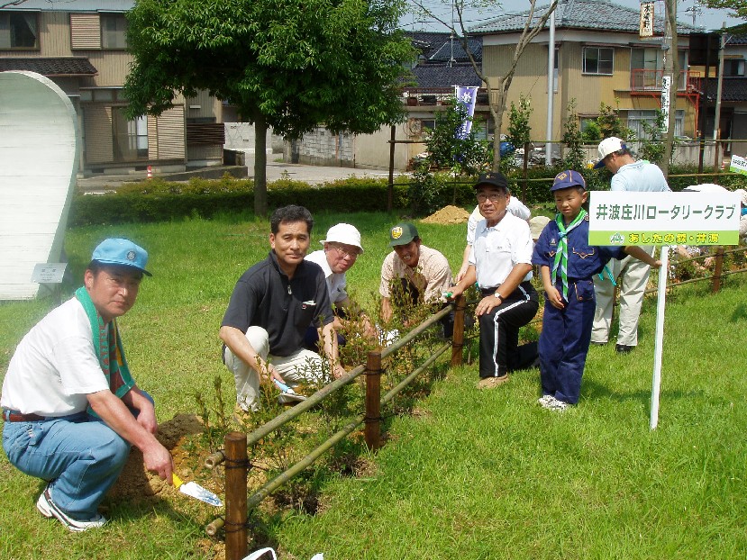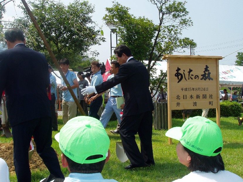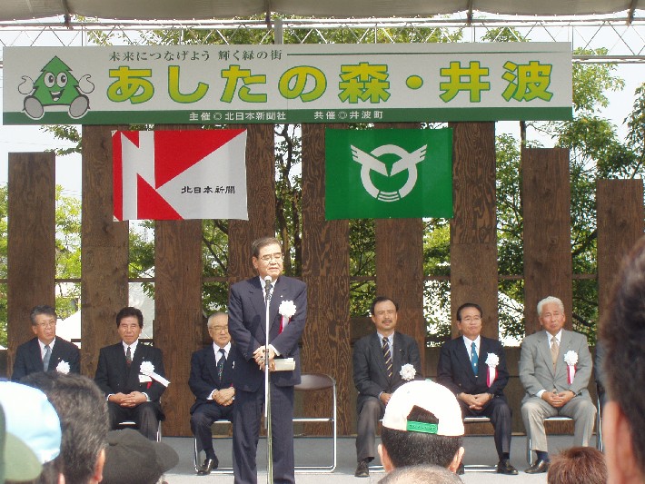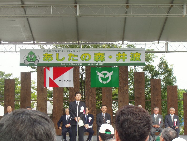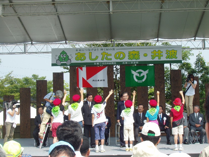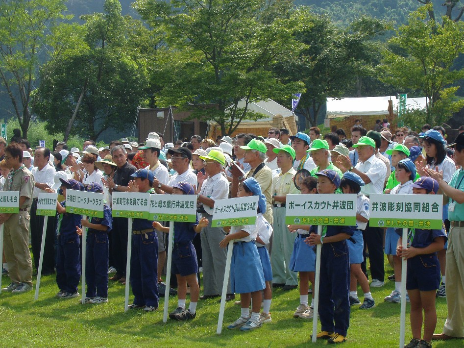 開会式の挨拶は、梅沢北日本新聞社社長と清都井波町長がされ、花と緑の少年団の子供たちの宣誓がありました。 井波庄川ロータリークラブも記念植樹を行いました。