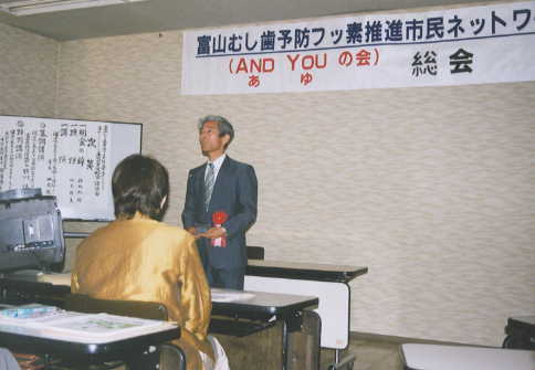 富山新聞(平成14年5月27日記事) 『むし歯予防へ フッ素利用を』 富山 富山むし歯予防フッ素推進市民ネットワーク(あゆの会)の総会は26日、砺波市文化会館で歯科医師、歯科衛生士など約50人が出席して開かれ、むし歯予防へのフッ素の効果や水道水へのフッ素利用など広く啓発していくことを申し合わせた。 山本武夫代表があいさつした。講演では県砺波保健所長の横川博所長が「フッ素の科学的効果に基づいて、利用などの対応を考えたい」と述べ、東北大学歯学部附属病院の田浦勝彦講師も「水道水へのフッ素導入が経済性、安全性が高く、効果もある」と述べた。 北陸中日新聞(平成14年5月27日記事) 『キャンペーン 4日に実施』富山むし歯予防推進市民ネット 富山むし歯予防フッ素推進市民ネットワーク(山本武夫会長)の総会は26日、砺波市文化会館で開かれ、虫歯予防デーの6月4日に同市のアピタ砺波店でキャンペーンを繰り広げるなどの事業計画を承認した。 国や日本歯科医師会は、80歳で自分の歯が20本以上あるようにむし歯予防の”8020運動”を展開。 県民歯の健康プランでも歯と口の健康づくりを推進しており、県内の歯科医師や歯科衛生士が中心となって昨年、同ネットワークが結成された。 総会では1年の活動を振り返るとともに、県内飲料水フッ素濃度調査やフッ化物利用調査などの研究活動の展開、いい歯の日(11月8日)のキャンペーン開催=ジャスコ砺波店=などの実施を決めた。 横川博・砺波保健所長が「健康長寿と歯の長命を目指して」、田浦勝彦・東北大学講師(予防歯科)が「健康長寿とフッ化物応用」と題してそれぞれ講演した。