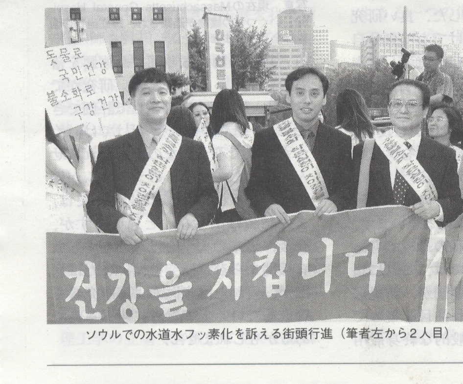 | 韓国における水道水フッ素濃度適正化の歴史(表1) 1977年 厚生大臣申鉉高氏が金光男教授(ソウル大学補綴科)から最善むし歯予防方策は水道水フッ素濃度適正化であるという情報を入手する。厚生大臣申鉉高氏は水道水フッ素濃度適正化を指示。 1978年 医政三課長、金鐘培教授(ソウル大学歯科公衆衛生学教室)に水道水フッ素濃度適正化策について相談。 歯科保健事業協議会設置(6名のメンバー、翌年10名から)。水道水フッ素濃度適正化モデル事業案。 1981年 鎮海市で水道水フッ素濃度適正化が開始(液状)翌年に、清州市で水道水フッ素濃度適正化が開始(粉末状) 1988年 歯科医師有志によって健康社会の為の歯科医師会が設立。 1990年 これ以後毎年水道水フッ素濃度適正化のシンポジウム、ワークショップを開催。キャンペーン活動の展開。 1994〜96年 各地で水道水フッ素濃度適正化の実施(京畿道果州市、浦港市、寧越郡、玉水郡) 厚生大臣が3大歯科保健政策目標(う蝕予防、歯周病予防、喪失歯の減少)を発表。 1997年 韓国水道公社(KOWACO)にる2市、2郡のフッ素濃度適正化。 厚生省に歯科保健課設置。 1999年 12市で水道水フッ素化開始。547万6000人(韓国総人口の約12.8%)がフッ素化の恩恵。 国会議員、黄圭宣氏が水道水フッ素濃度適正化を推奨する歯科保健法案を国会に提出する。 2000年 歯科保健法案が大統領公布される。 2001年 水道水フッ素濃度適正化20周年記念 |