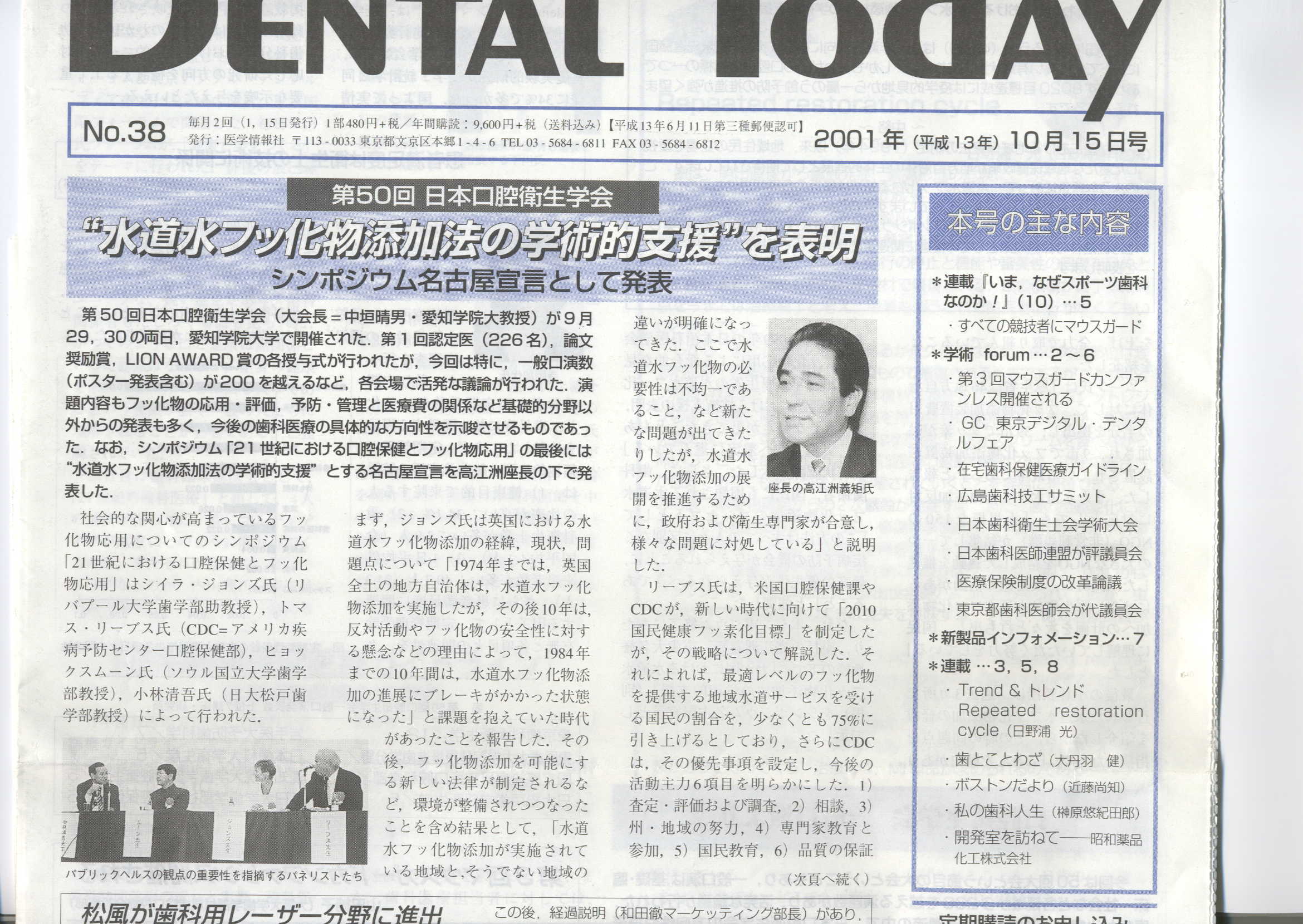 最後の小林教授は,過去3ヵ所で行われた水道水フッ化物添加の経緯を紹介しながら、その問題点を指摘した上で。「こうした歴史がありましたが,1999年の日本歯科医学会の『フッ化物応用による総合的な見解』,2000年厚生省の水道水フッ化物添加要請における技術的支援の表明、など大きな動きが出てきたこともあり,実施方向へ着実に進んでいる」と現状認識を示した。さらに,歯科関係者,国民にも周知徹底される水道水フッ化物添加のコンセプトとして「この方法はすべての人々に区別なく疾病予防の機会が与えられることに、最高の優先権が与えられるべきであること」と強調した。