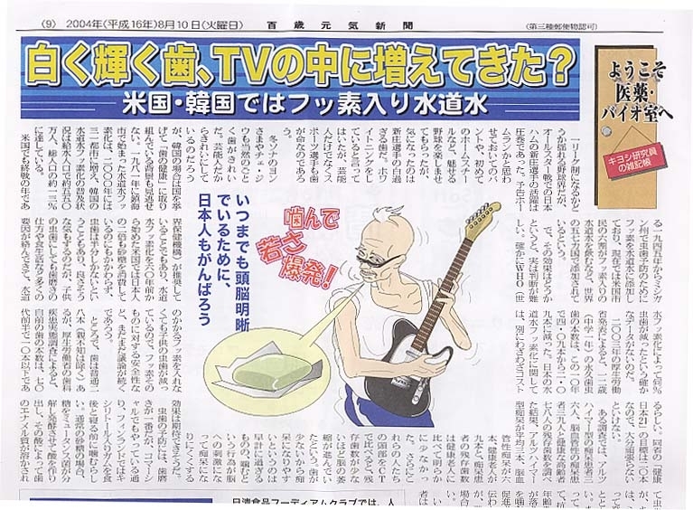 | 晴佐久先生、百歳元気新聞のフロリデーション情報有り難うございました。 百歳元気新聞は月刊新聞(10日発行)で、3万5千部印刷されているそうです。 ジャスコ、漢方薬局などで配布されているそうで、日本食糧新聞社の名にあるように、食の面から管理栄養士さんが店頭などで説明しているそうです。 記事は「バイオプログレス研究所 主宰 高橋 清さん」の署名記事だそうです。 この機を捕らえて、さらにフロリデーション記事の掲載につながるようなアプローチをして行きましょう。 また、管理栄養士さんたちにも、有益な栄養素としてフッソを理解していただくような取り組みが必要になるでしょう。 北海道での栄養士さんたちの活動( 葭内顕史先生のマネージメント )が活かされるものと思います。(田浦先生のコメント) 発行所 日本食糧新聞社 東京都中央区八重洲1−9−9東京建物ビル 03−3432−5700 記者 バイオプログレス研究所 主宰 高橋 清 |