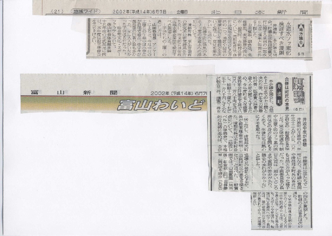 | 北日本新聞 地方議会便り 6日 井波町(一部抜粋) ―虫歯予防の効果のあるフッ素の水道水への添加について 清都町長 厚生労働省の研究班の研究成果を待ちたい。』将来的には砺波広域水道企業団で検討すべき課題になる。 |