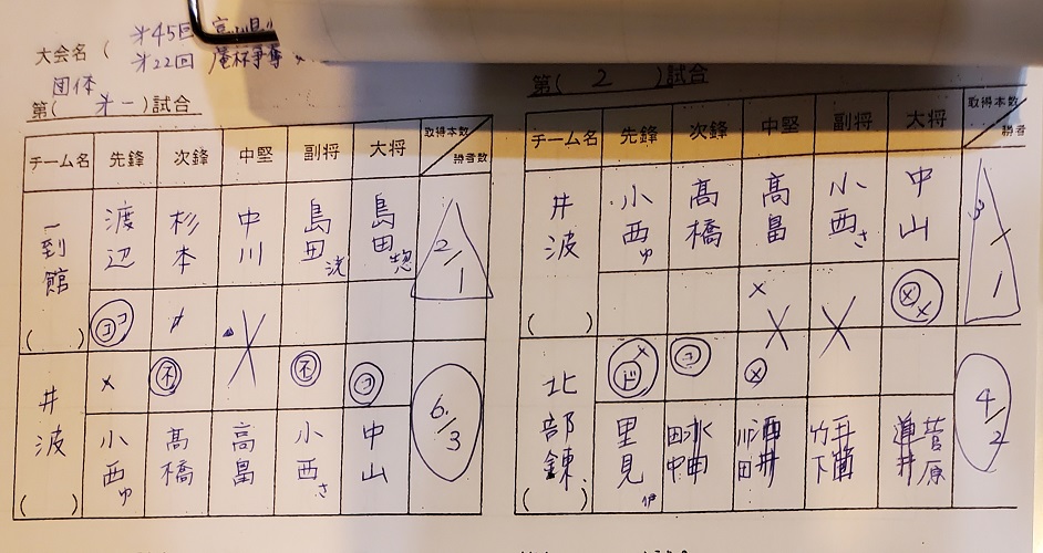 12月12日、第45回富山県少年剣道錬成大会・第22回庵杯争奪剣道個人優勝大会(しんみなとアイシン軽金属スポーツセンター)・・・成績表 個人対戦表(画像)