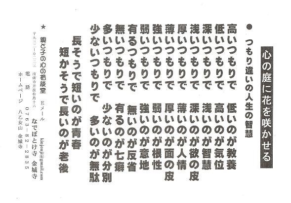 本日、2枚のプリントを持ってきました。1枚目は、「心の庭に花を咲かせる」と題して、「つもり違いの人生の智慧」です。かいてあるとおりだと思います。2枚目は、「なでぼとけさんの心の薬」と題して、いくつか詩が載せてあります。そのうち「いろはにほへと…」は高野山真言宗の宗歌です。高野山の開祖、空海上人が作られたと