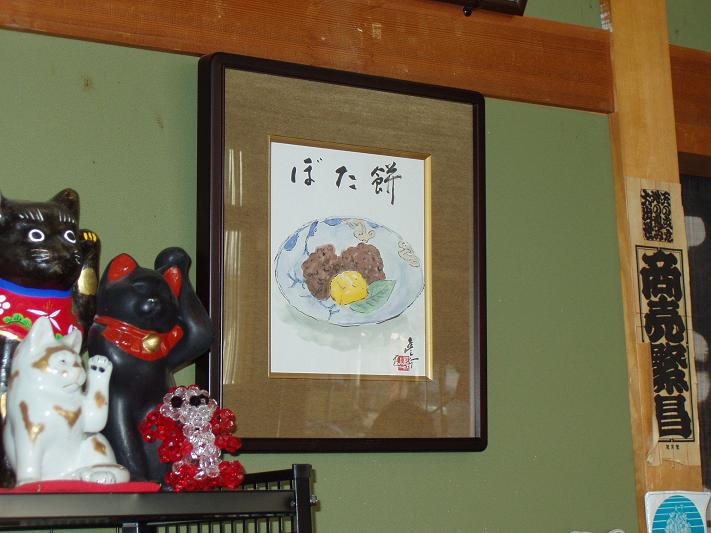 井波庄川ロータリークラブ会員 庄川町 川那辺菓子舗の店先に、同じく会員の横山豊介先生の「ぼた餅」の絵が飾ってあります。