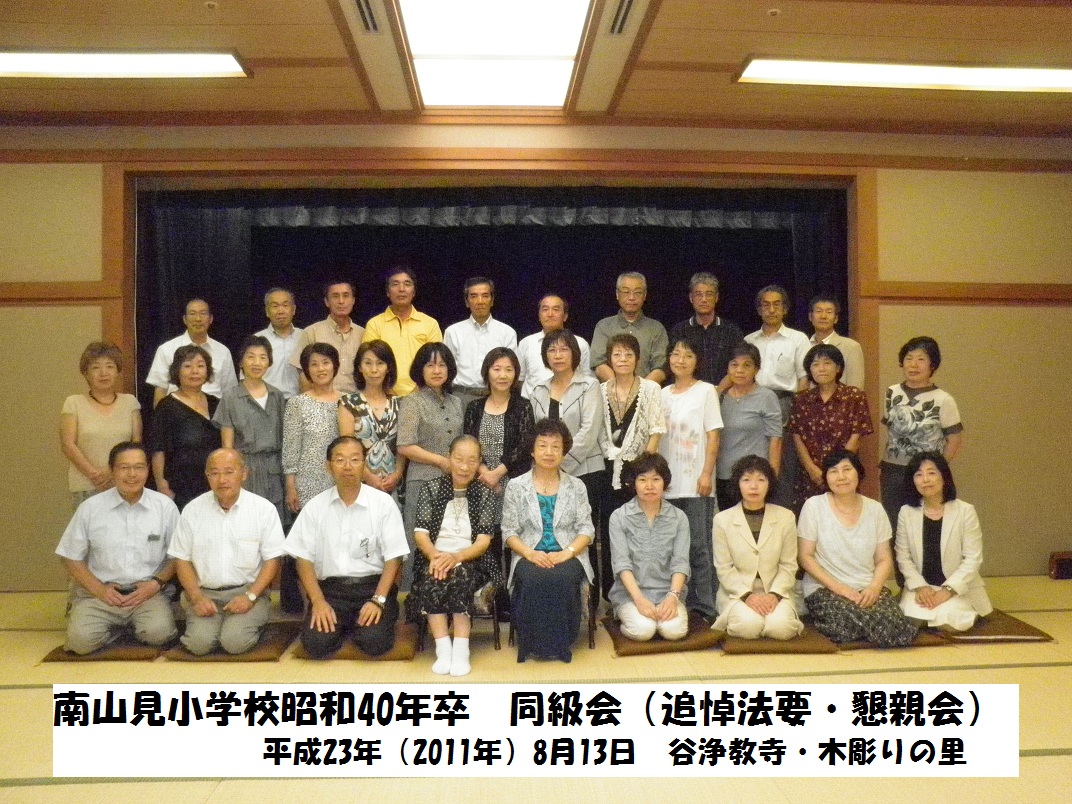 | 来年の還暦を控え、久しぶりに南山見小学校の同級会を開きました。 同級生では、故松田英樹君(樹法院釋浄英・昭和63年3月5日命日)が、恩師では、故山本威先生(C光院釋玄照・平成16年3月24日命日)が、亡くなられており、追悼法要を、南砺市谷の浄教寺で営んでから、木彫りの里で、懇親会をして、再会を祝いました。堀静枝先生、菊賀寛子先生には、御健勝で、この会に久し振りにお招きでき、楽しいひと時を過ごして頂きました。 還暦を過ぎたら、毎年集まる機会を持ちたいという話が大半でした。幹事の皆さん(私もその一人ですが)、お世話をよろしくお願いします。 |