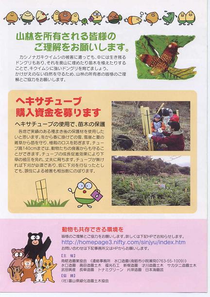![]() 北日本新聞「沈黙の森」ホットライン п@076-433-7281 Fax 076-431-2110 メール mori@ma.kitanippon.co.jp 南砺造園業協会 会長(水口)п@0763-55-1009 事業担当 河合耕一さんのHP http://homepage3.nifty.com/sinjyu/index.htm 善意の窓口 「七山千春(郵便貯金)13280−13349361」まで |