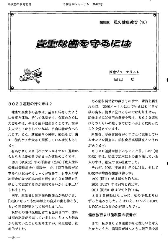 田辺功氏の論文:予防医学ジャーナル 第472号 24ー27ページ「貴重な歯を守るには」をアップしました。田辺先生は、朝日新聞の医学記事担当の記者でした。日弁連の意見書(2011.1)を、「“日本の常識は世界の非常識”の典型」と評しています。この論文掲載に関しては出版元の公益財団法人予防医学事業中央会(