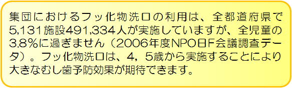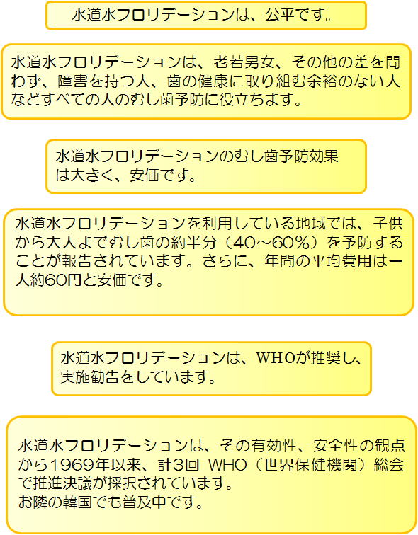 フッ化物は、全ての生き物や海、川など、自然界のあらゆる物の中に存在しています。それらを上手に利用することによって、むし歯を予防し、むし歯の痛み、むし歯による歯の喪失を防ぎ、QOLを高めます。