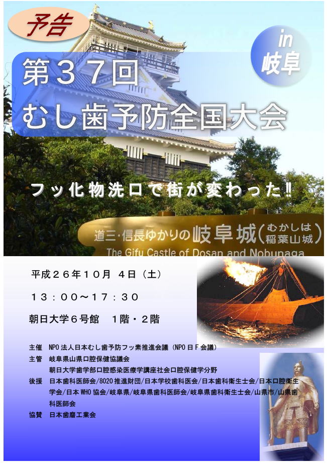 岐阜県瑞穂市穂積1851 TEL(代)058-329-1111 4.主 催 NPO法人日本むし歯予防フッ素推進会議(通称NPO日F会議) 5.主 管 山県口腔保健協議会、 朝日大学歯学部口腔感染医療学講座社会口腔保健分野 6.後 援 日本歯科医師会、8020推進財団、目本学校歯科医会、目本歯科衛生士会、 日本口腔衛生学会、日本WHO協会、岐阜県、朝日大学、岐阜県歯科医師会、 岐阜県歯科衛生士会、山県市、山県歯科医師会 7.事務局 〒501-0296岐阜県瑞穂市穂積1851 朝日大学歯学部社会口腔保健学分野内